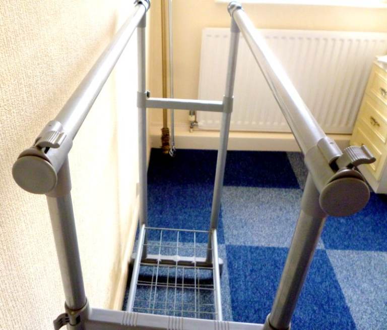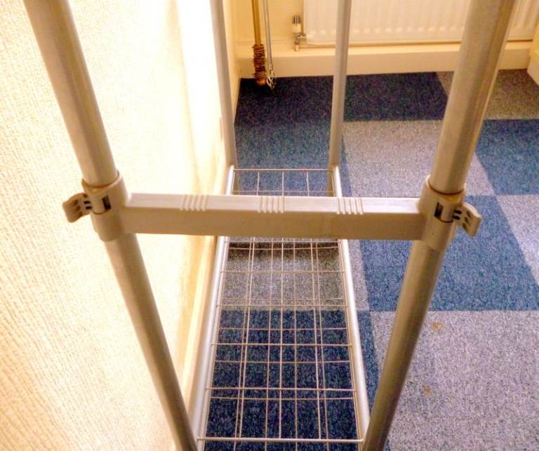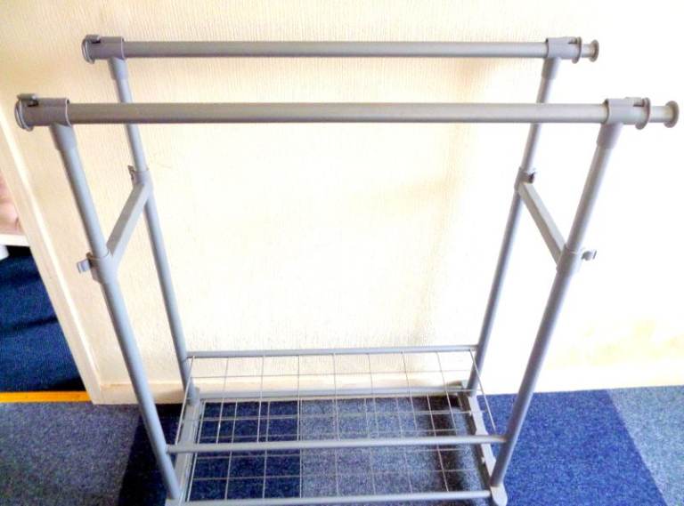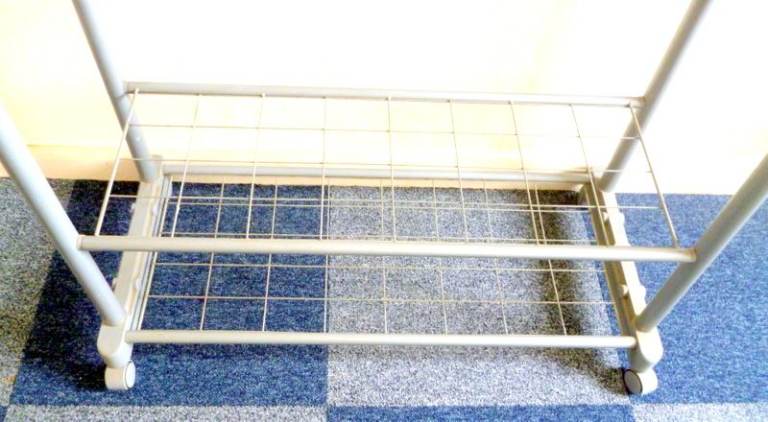 PORTABLE CLOTHES RACK ON WHEELS WITH TWO TIER SHOE STORAGE.