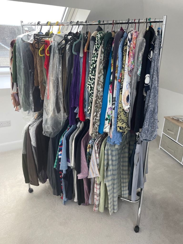 White clothes rail on wheels.