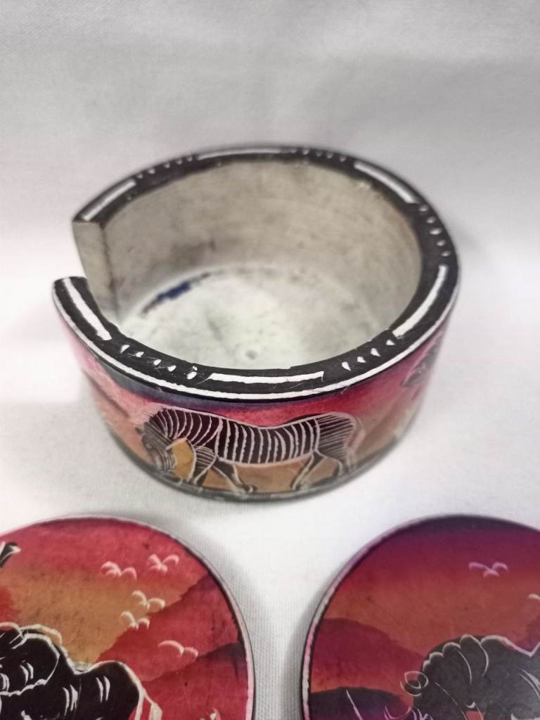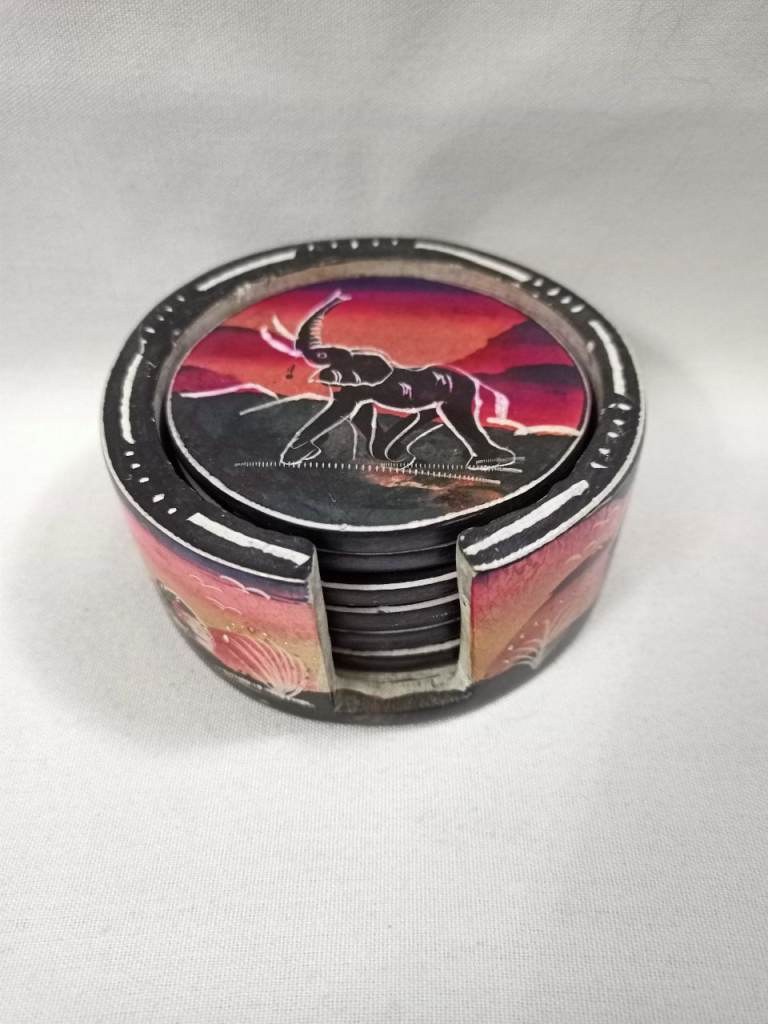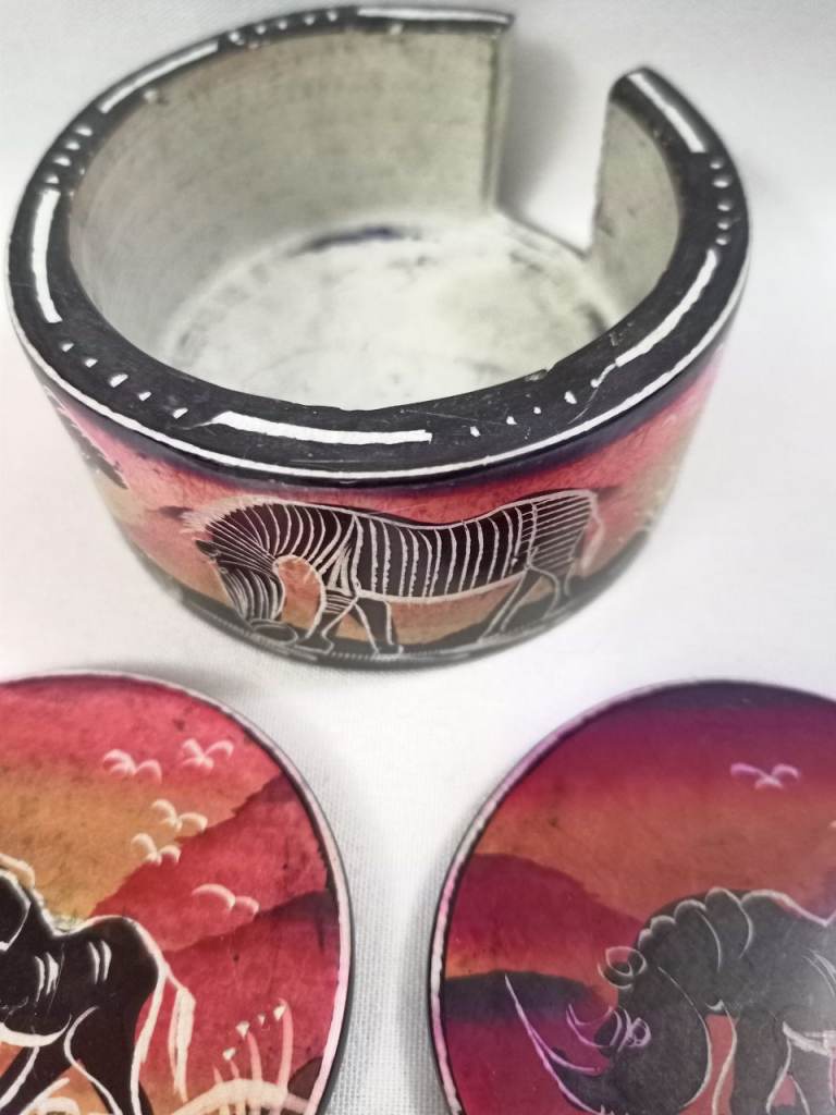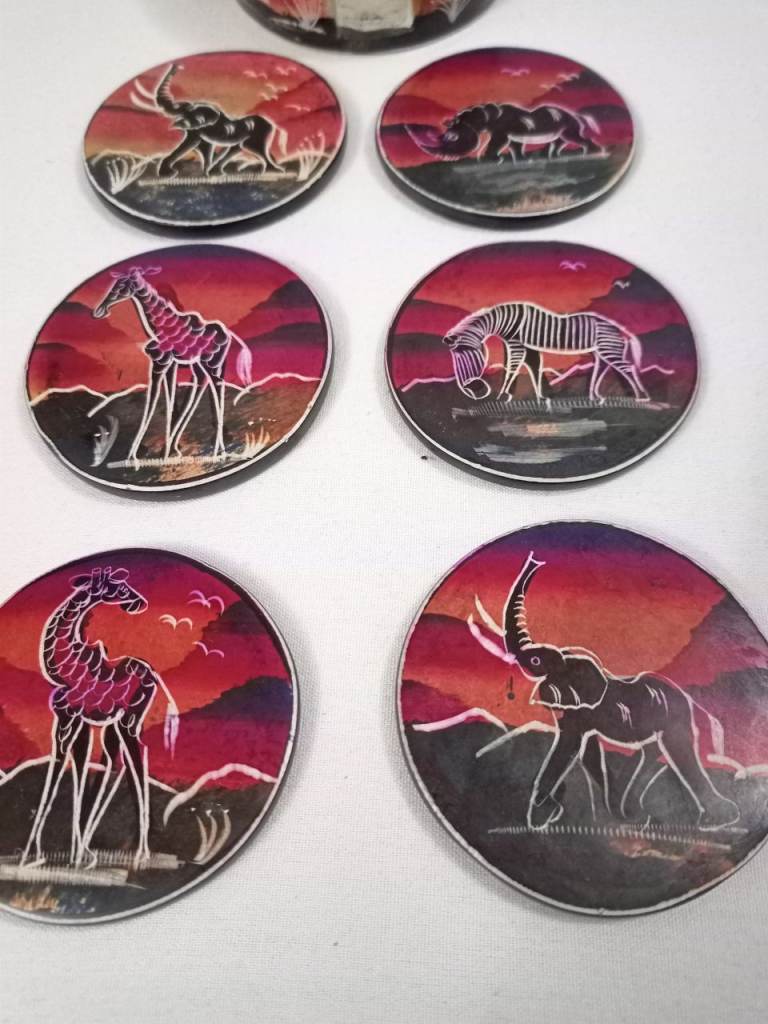 LOVELY AFRICAN CARVED SOAPSTONE SAFARI COASTERS X6 NICE VIBRANT COLOURS VERY GOOD USED CONDITION.