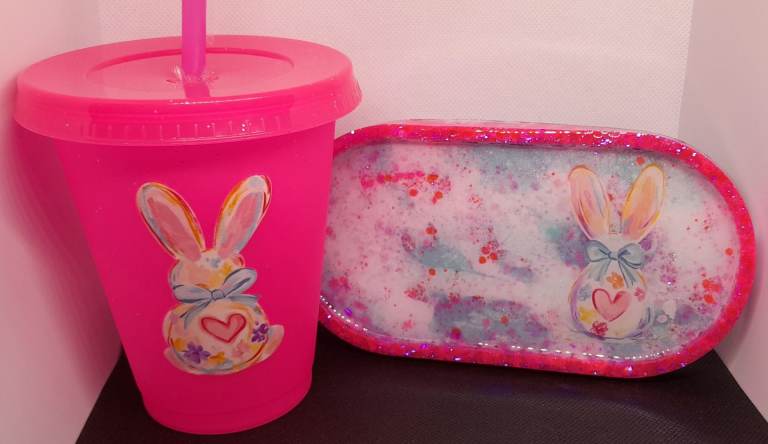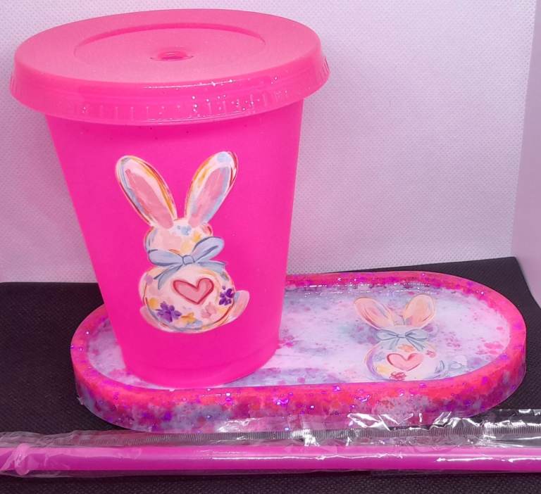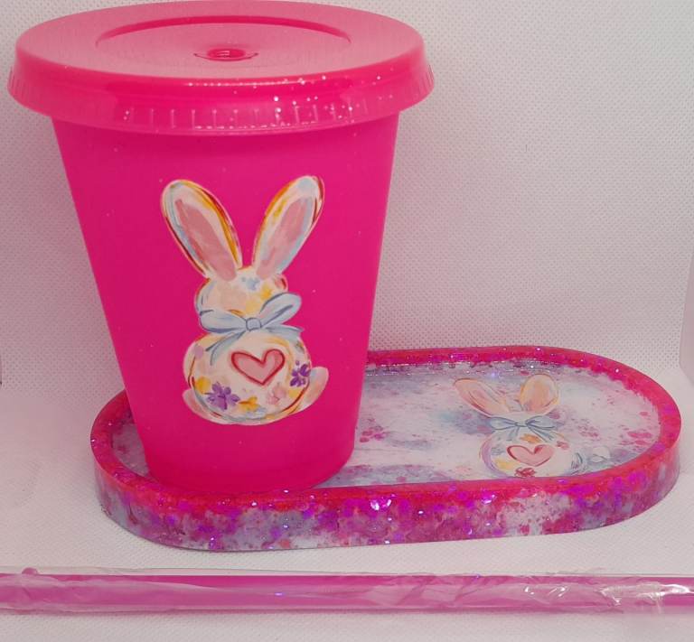 Gorgeous handmade easter bunny coaster tray and cup with straw