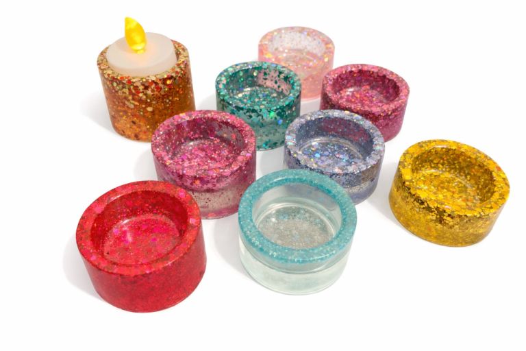A collection of 9 handmade colourful resin and glitter LED tea light holders.