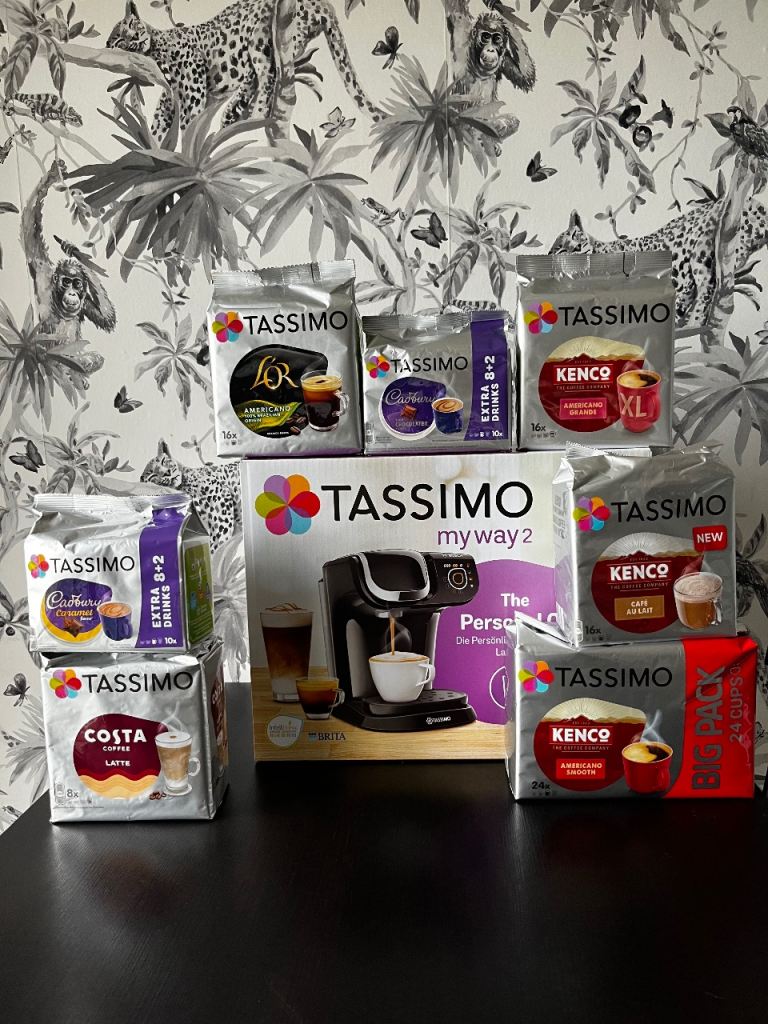 There is a Bosch Tassimo Coffee Machine with a disc holder and my favourite Latte Macchiato.