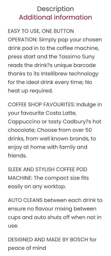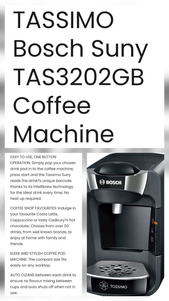EASY TO USE, ONE BUTTON OPERATION: Simply pop your chosen drink pod in to the coffee machine, press start and the Tassimo Suny reads the drink?s unique barcode thanks to its Intellibrew technology for the ideal drink every time; No heat up required.