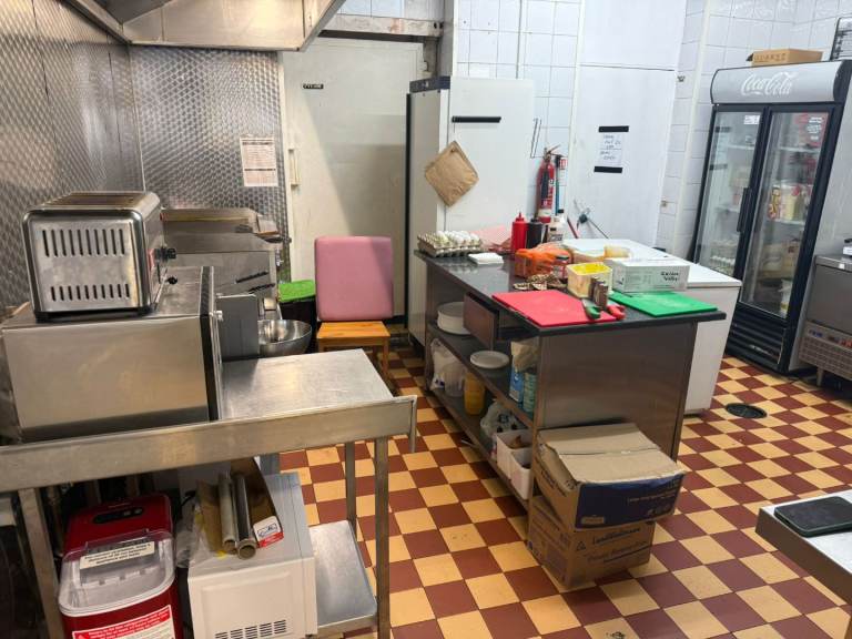 Fully fitted kitchen with professional coffee machine & grinder, cake display, juicer, griddle, fryer, fridges, extractor canopy, counter, drink fridges.