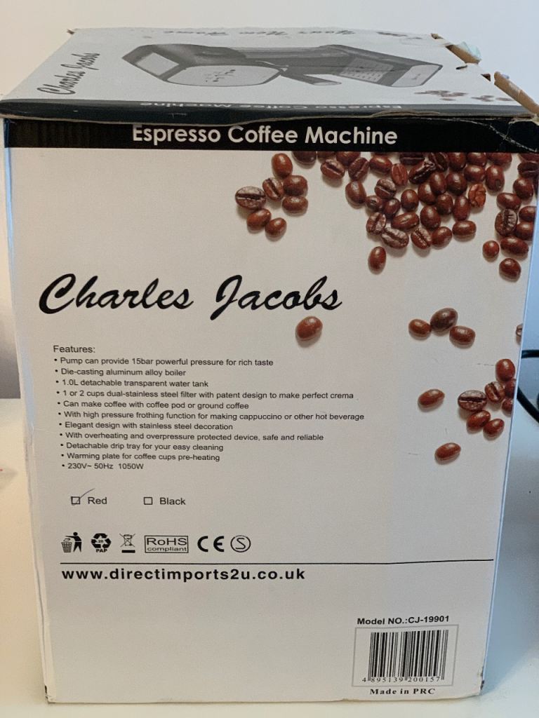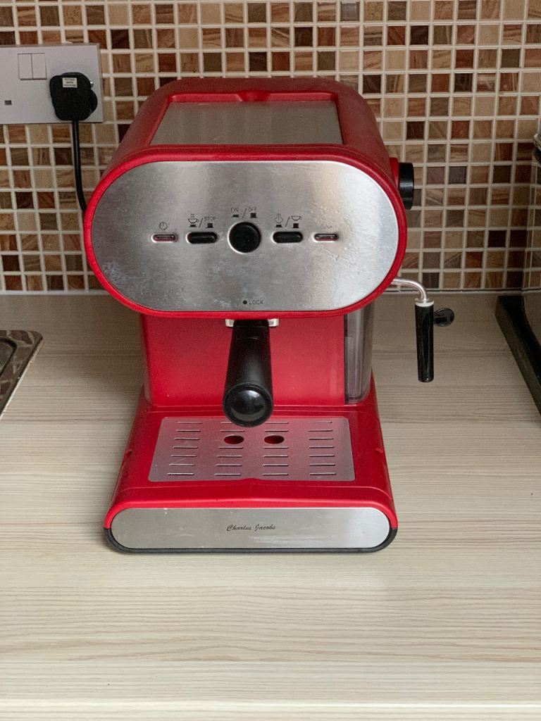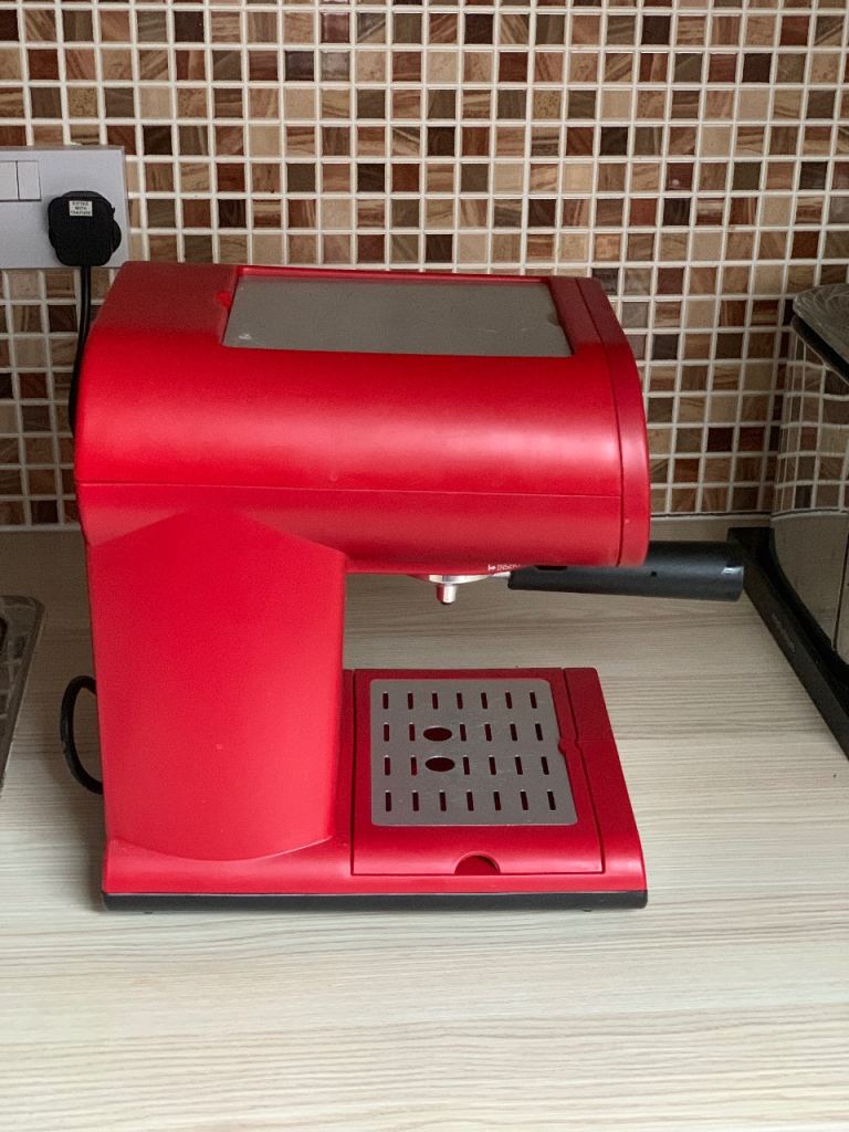 This lovely espresso coffee machine is a smart red colour. It has a 15 bar powerful pressure. Can make coffee with ground coffee or a pod. Also has a high pressure frothing function for milk