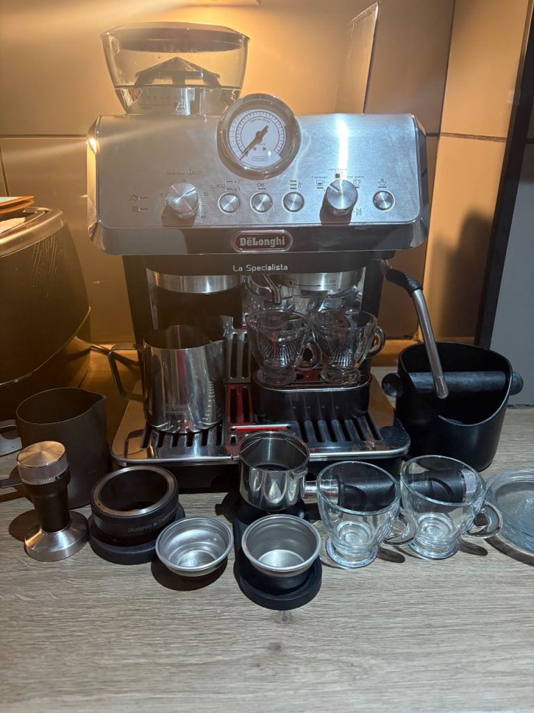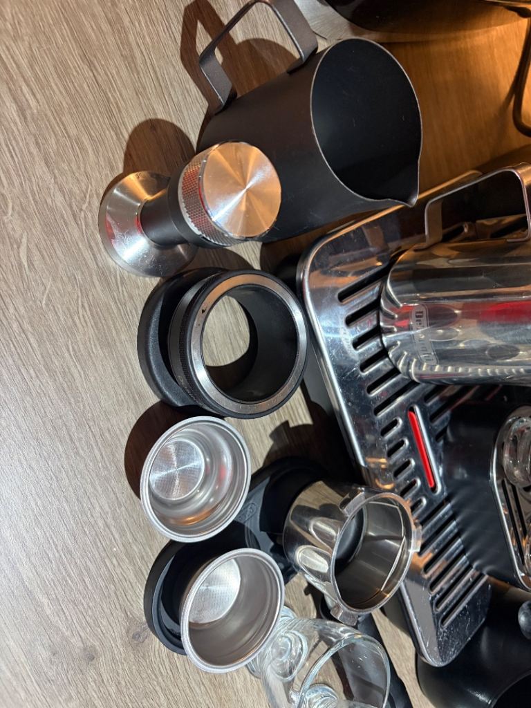 it comes with x4 expresso cups with plates , comes with coffee grounds bin , x2 jugs and a bag of beans fresh unused.
