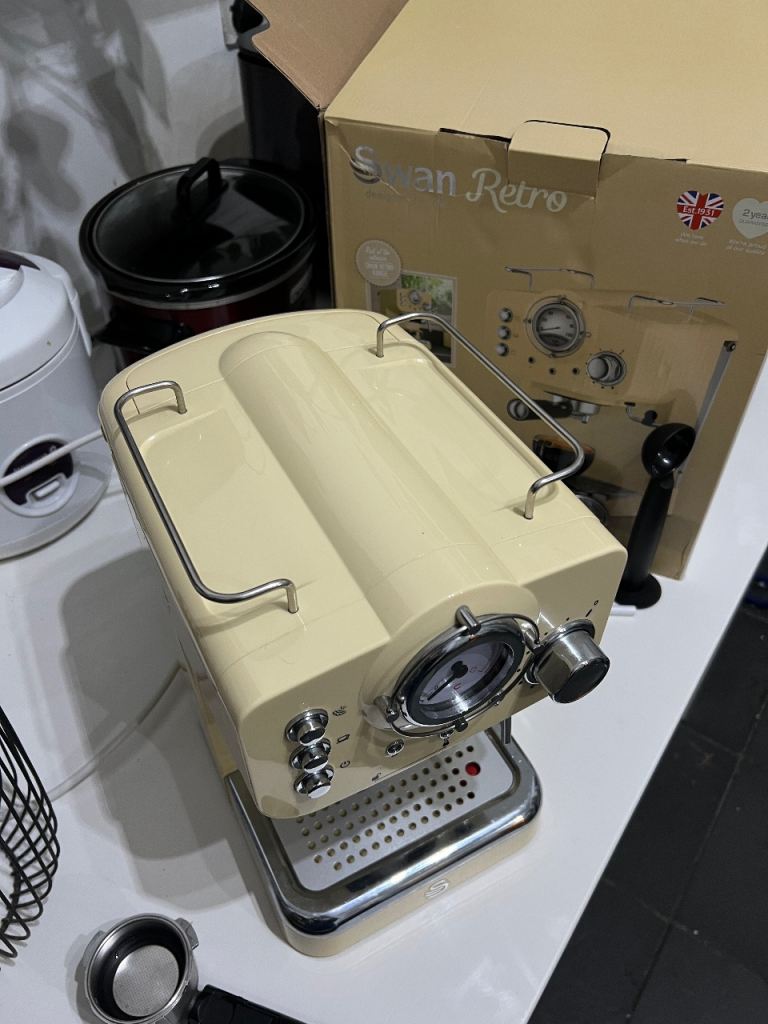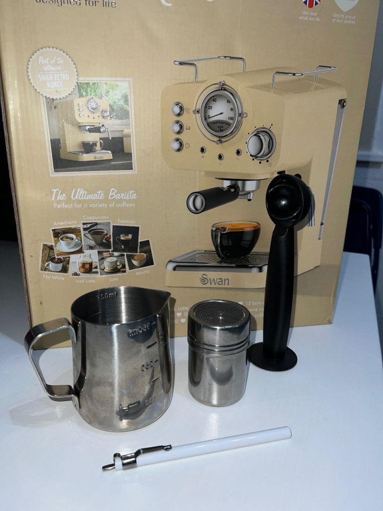 Selling swan espresso coffee machine. Functional, selling with latte art pen, jug, tamper/measuring spoon and chocolate shaker for cappuccinos.