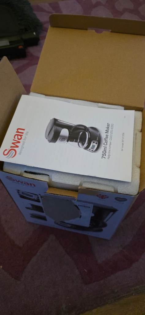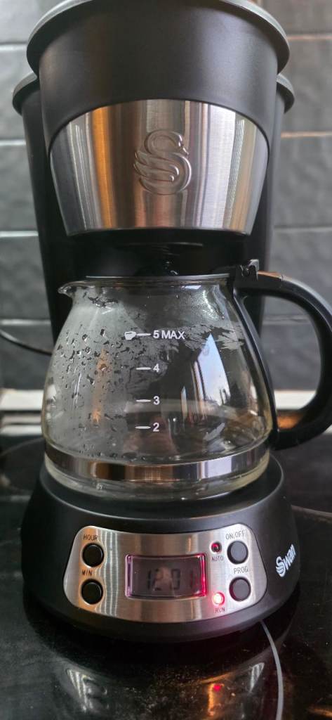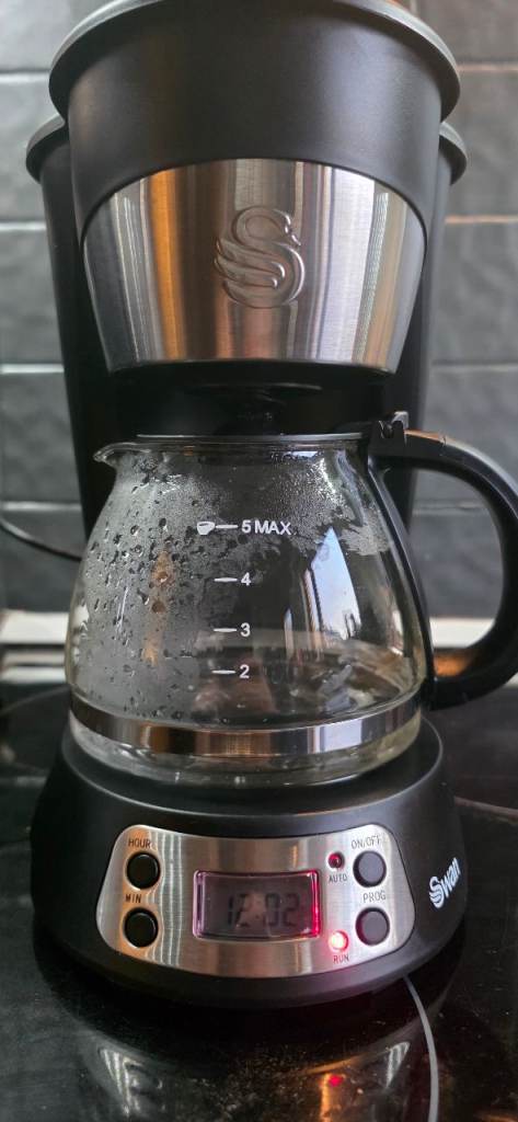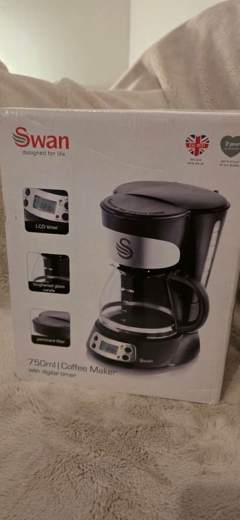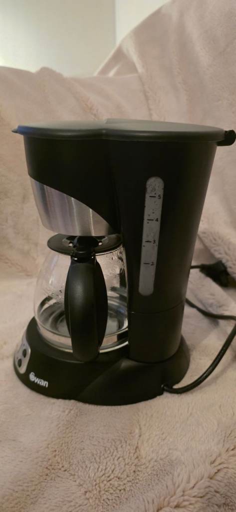 The Swan 750ml Coffee Maker Machine with Anti-Drip Function is a stylish and practical appliance for any kitchen. This electrical coffee maker, made of durable plastic in a sleek black colour, offers a capacity of 0.75 litres and a power of 700W. It features useful functions such as auto shut-off, timer, pause-and-serve, and a keep warm function. The built-in water filter and permanent filter ensure great-tasting coffee every time, while the display and programmable settings make it easy to use. With its compact dimensions of 26cm height and 17cm width, this coffee maker by Swan is a convenient and efficient choice for any coffee lover.