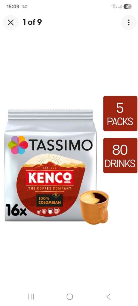 The Tassimo 100% Colombian Coffee Pods are a convenient 5-pack containing 16 pods each totalling 80 drinks, perfect for coffee lovers who enjoy a strong smooth roast.