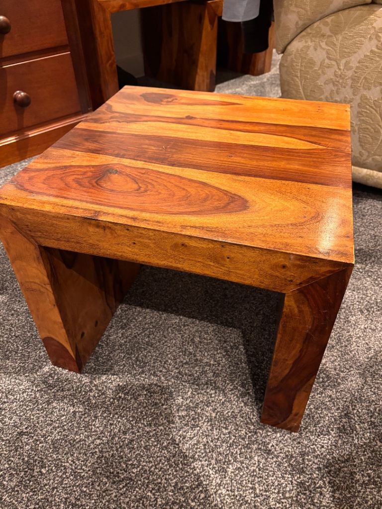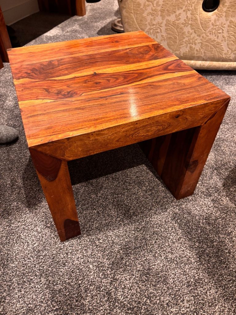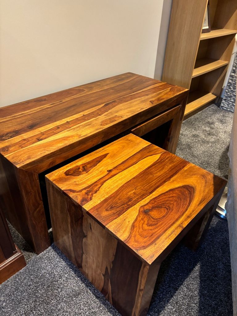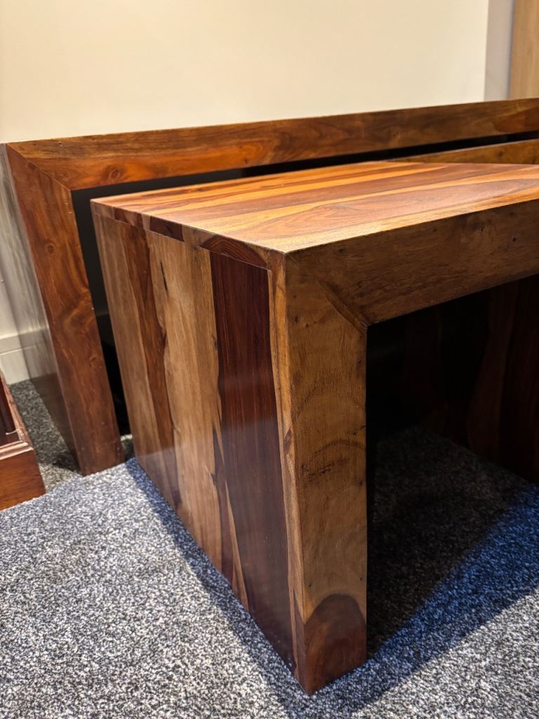 Beautiful set of solid mango wood nest tables, perfect for adding warmth and style to any living room. These are used but well looked after, with only light signs of wear that add to their natural charm.