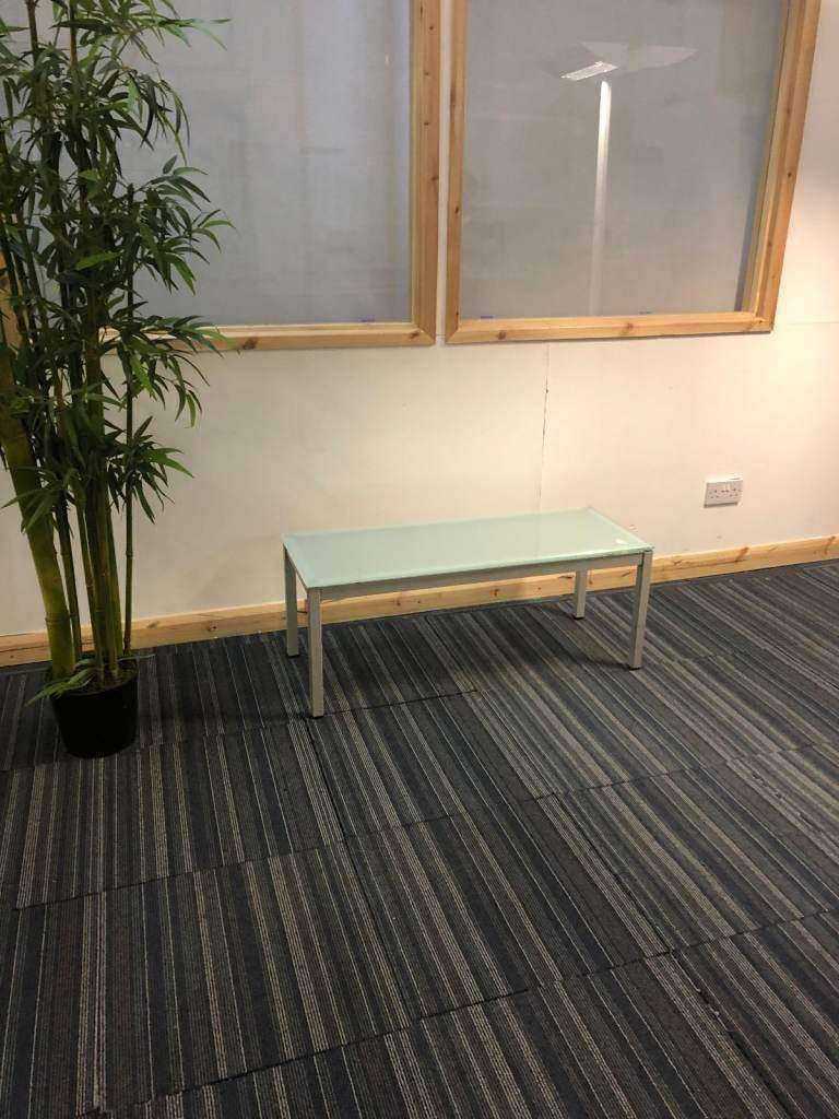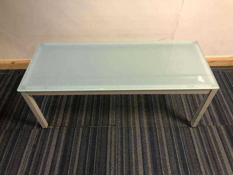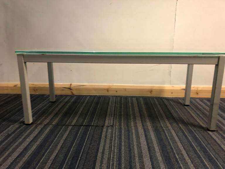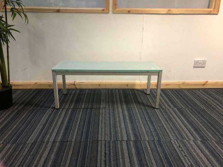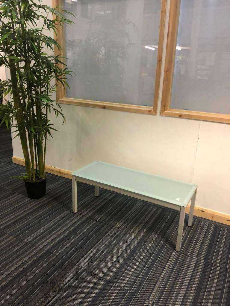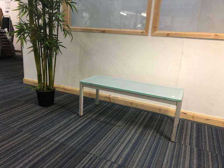 98cm x 38cm Blue hued glass rectangle office reception waiting breakout area coffee tables