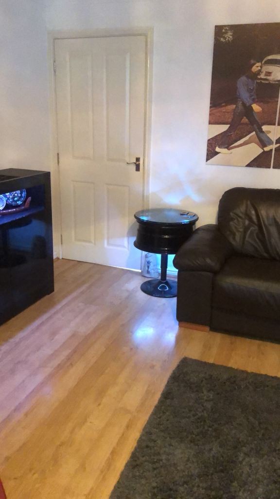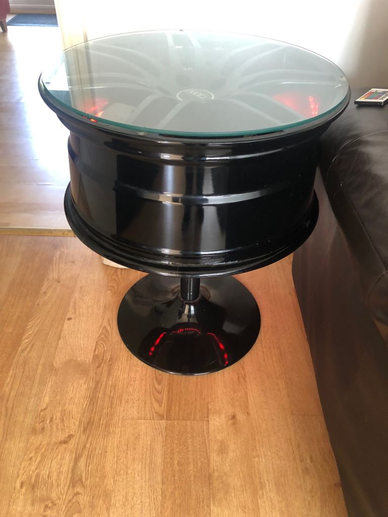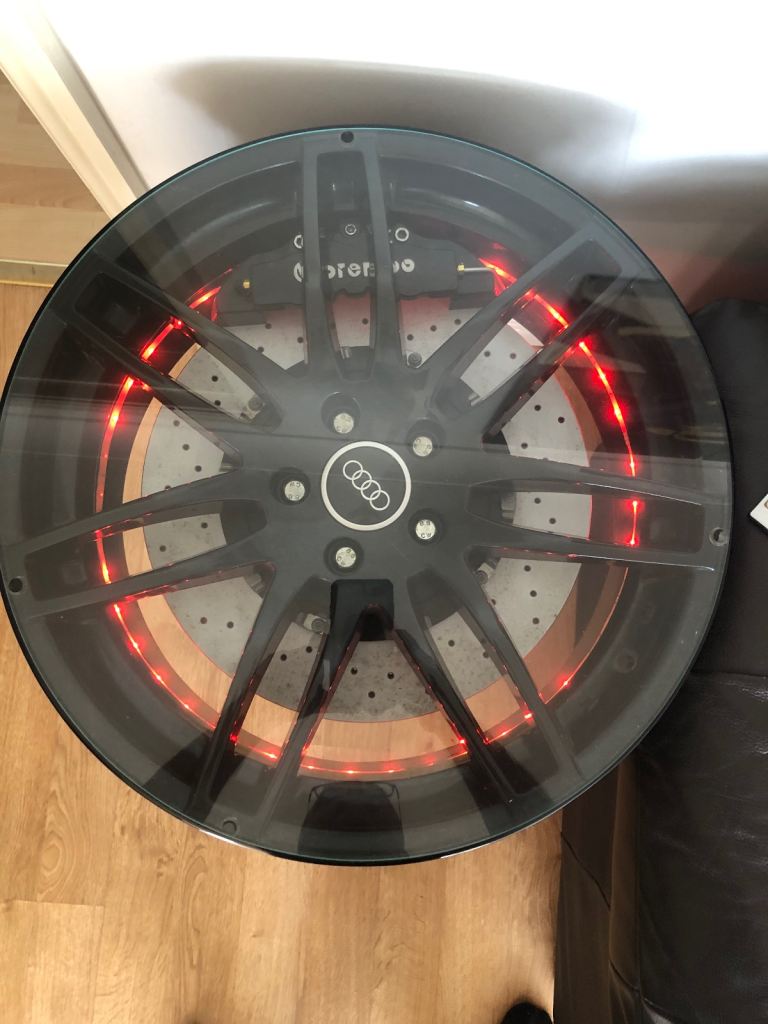 Audi alloy wheel and disc converted in to a table with led lighting remote control