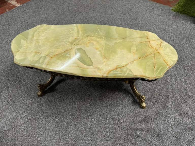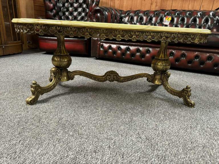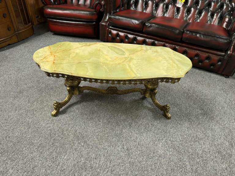 Add a touch of elegance and sophistication to your living space with this stunning brass and onyx coffee table. Its weight and quality craftsmanship make it a statement piece suitable for any stylish home.