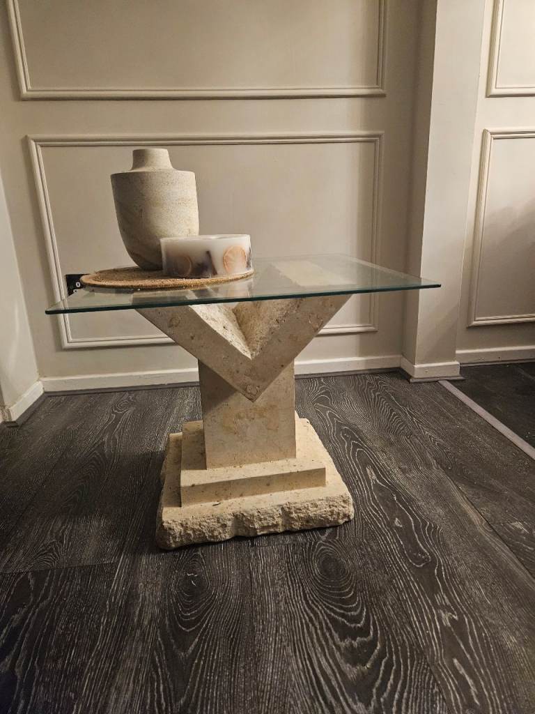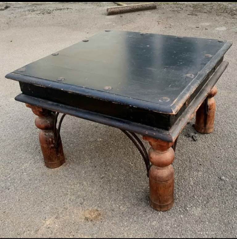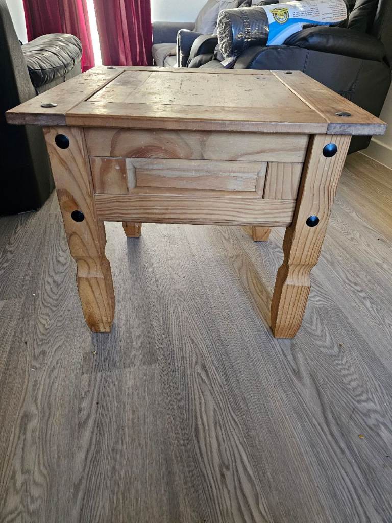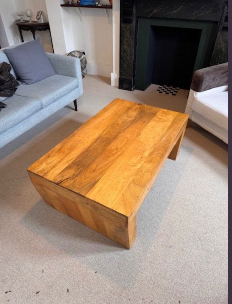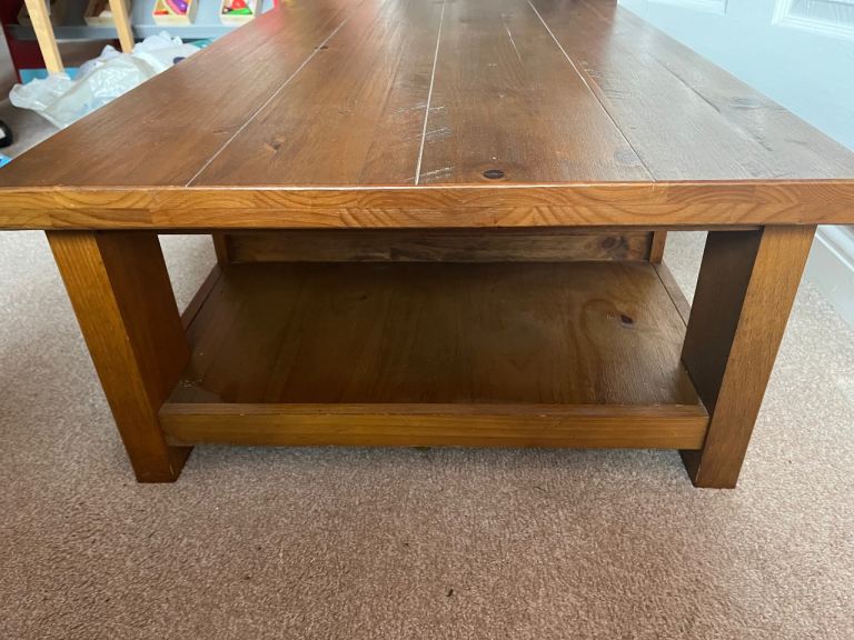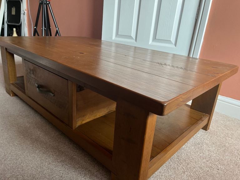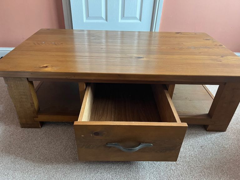 Light brown coffee table with storage drawer built in and shelving / open storage space on either end of the table. Solid wood.