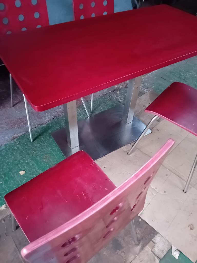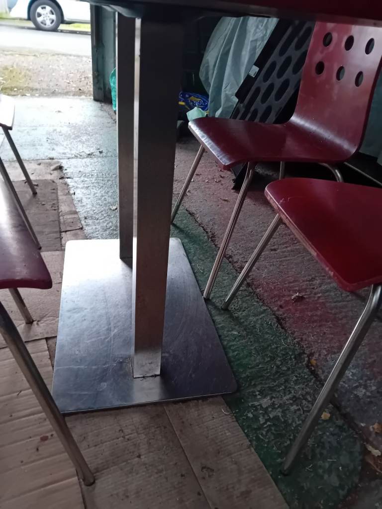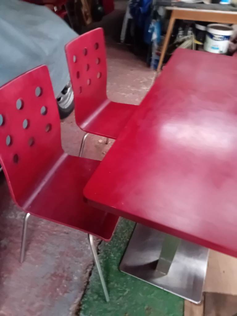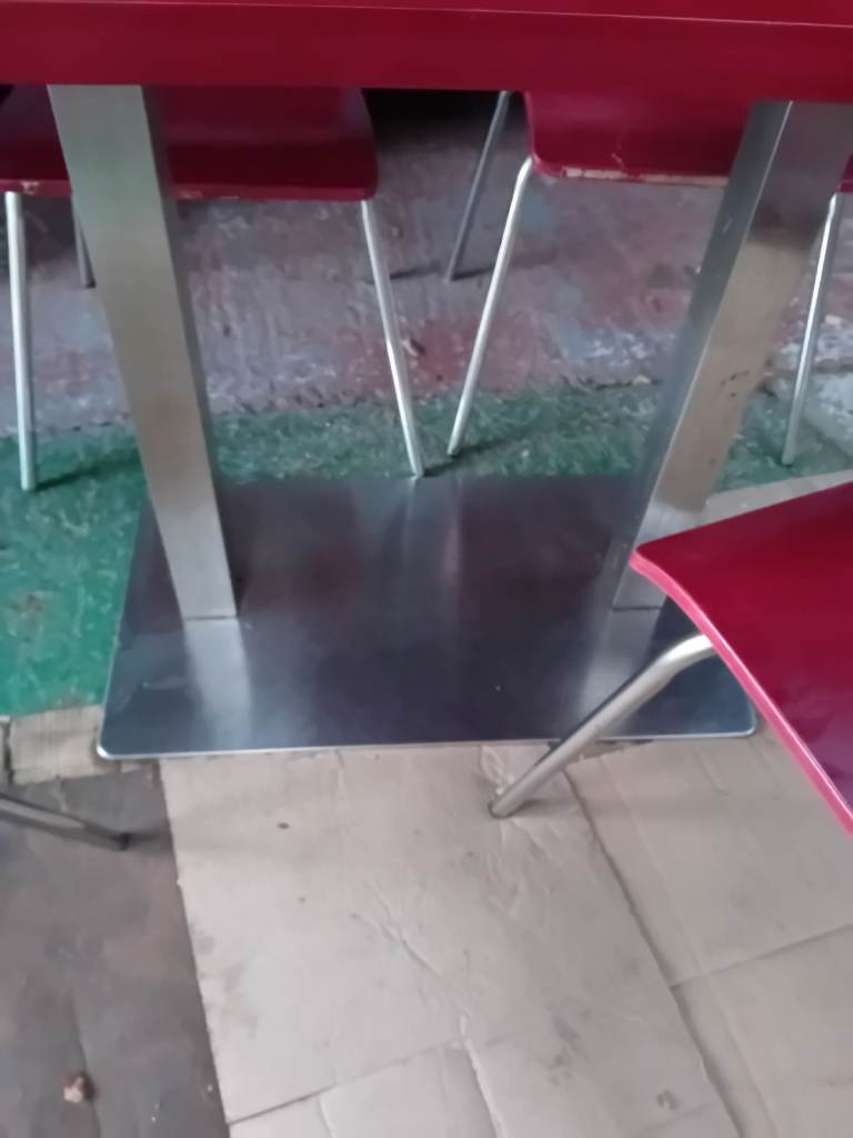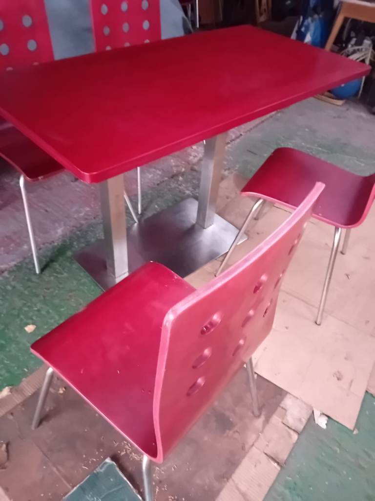 A set of 4 chairs and chrome table base with table top. The retro chairs are in good condition a bit of wear and tear as they have come from a cafe the same goes for the table . In clean condition and chairs ate very lightweight . The table top can be easily assembled and dissembled. Can assist for local delivery . Ideal for a small cafe . I have 4 sets available.