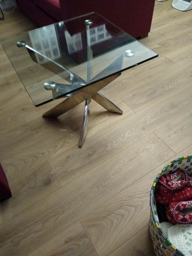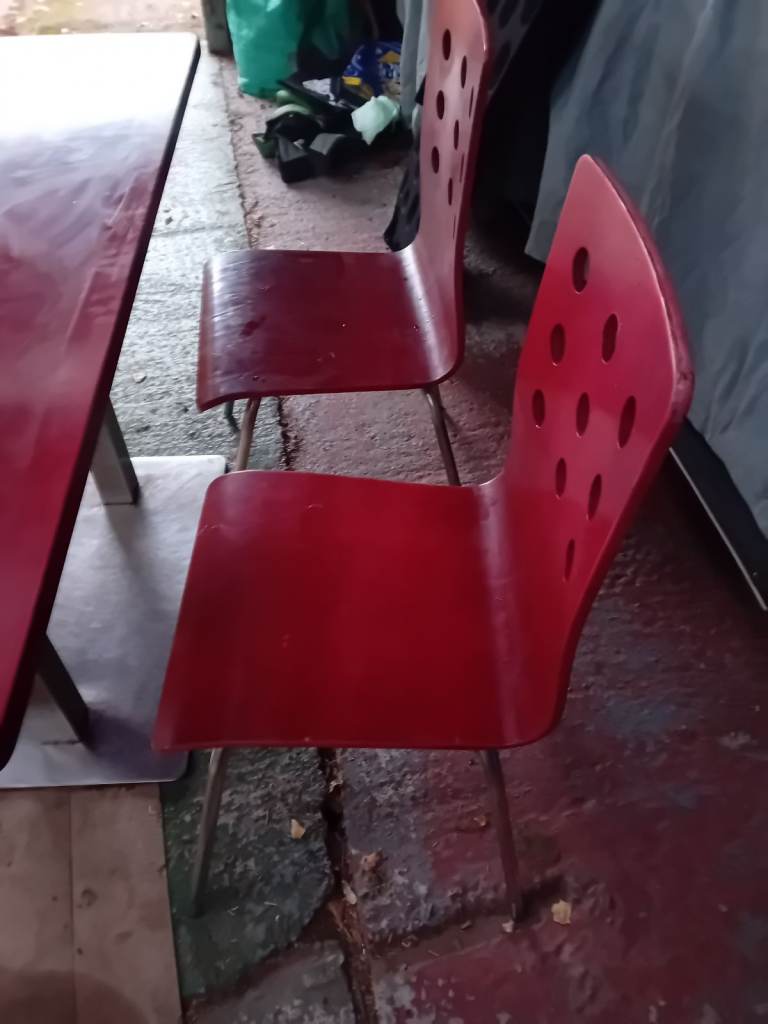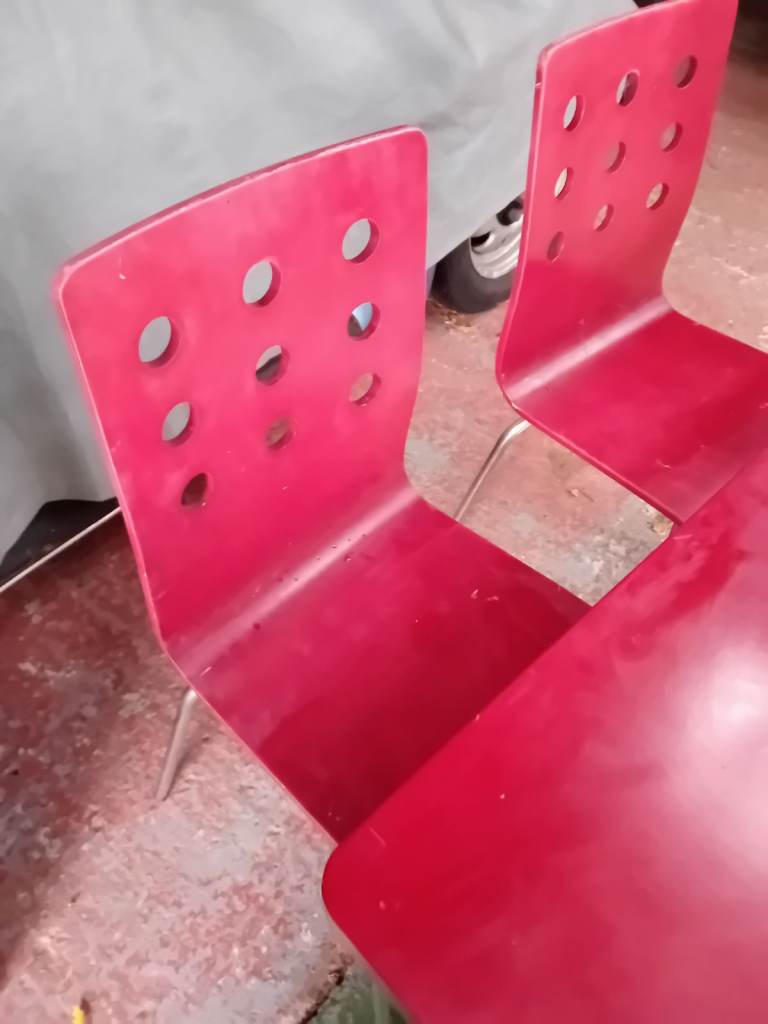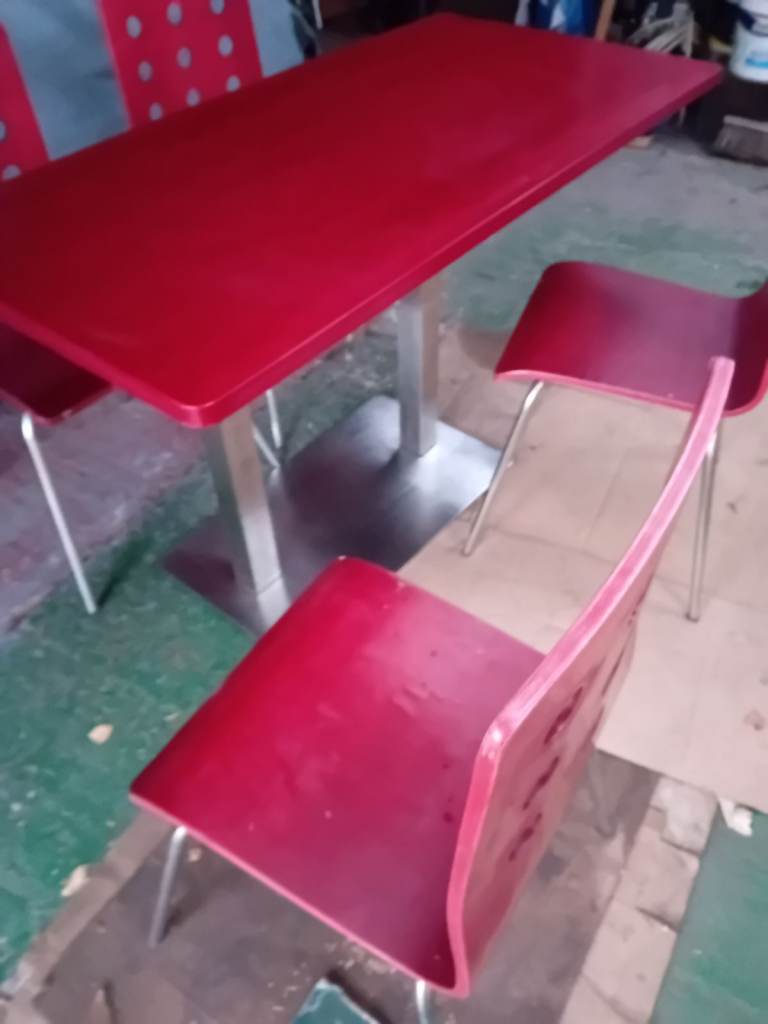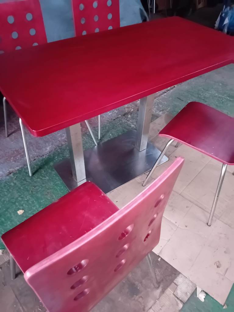 A set of 4 chairs and chrome table base with table top. The retro chairs are in good condition a bit of wear and tear as they have come from a cafe the same goes for the table . In clean condition and chairs ate very lightweight . The table top can be easily assembled and dissembled. Can assist for local delivery . Ideal for a small cafe . I have 4 sets available.