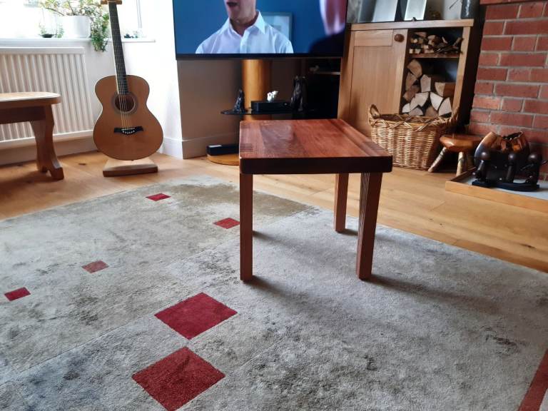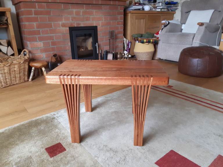 Solid mahogany coffee table unique bespoke design splad legs. Made from a old mahogany front door 40mm thick Solid top, Hard wax oil finish.