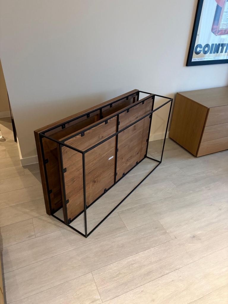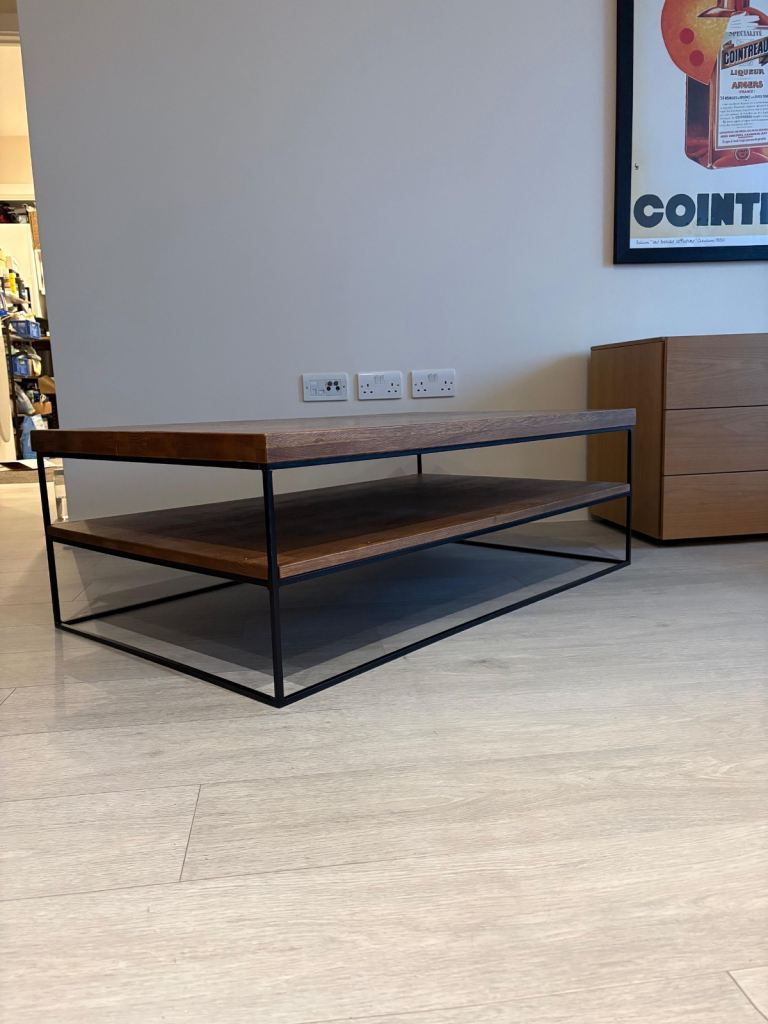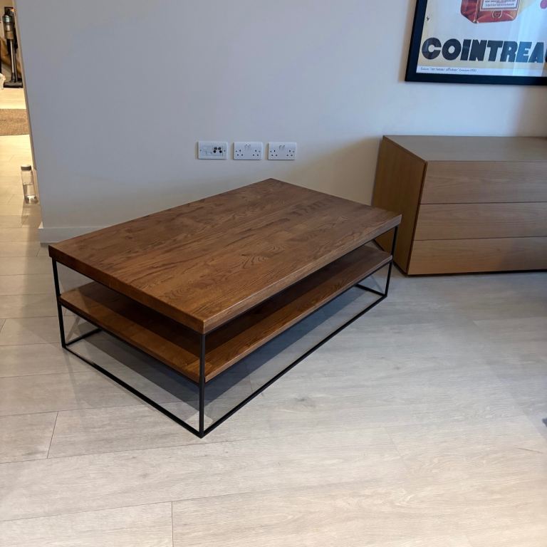 Solid oak Cox & Cox coffee table with black iron frame, two shelves and a really clean, minimal look. Excellent condition, practically no signs of use.