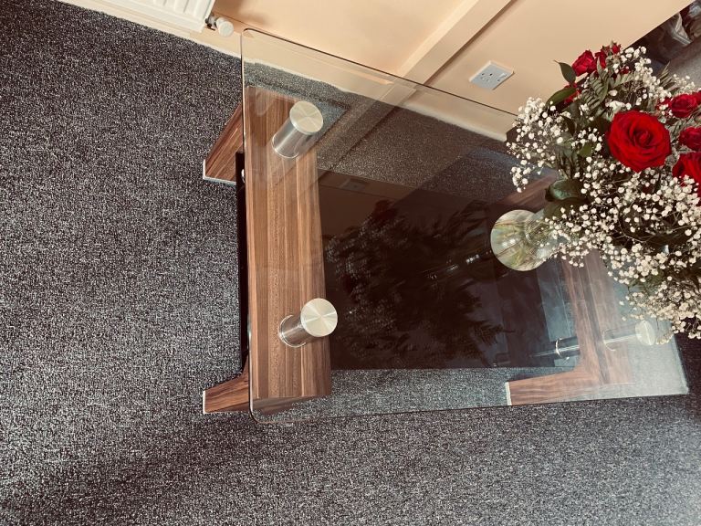 Modern coffee table in good condition, in black glass and transparent on top, it is 110 cm by 64 cm, h-42 cm, I can deliver at extra cost, no offers please.