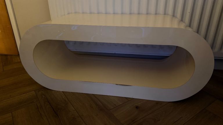 Contemporary curved cream gloss coffee table, handmade in NI. In good condition. Slight separation of gloss coating in a couple of places but a bit of glue would sort that! Very few scratches. Was used as a TV stand.