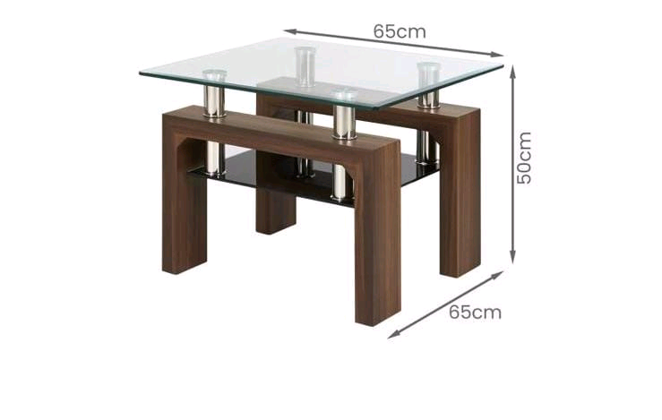 Classic wood, sleek glass and modern chrome details. Small DFS square Coffee Table.