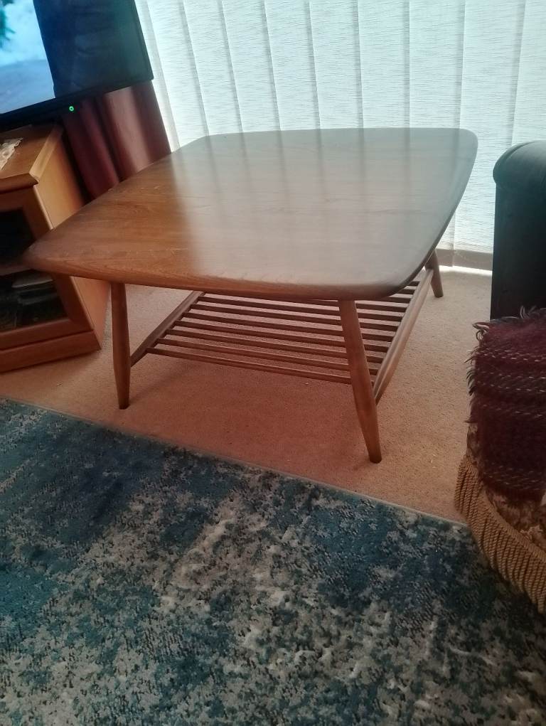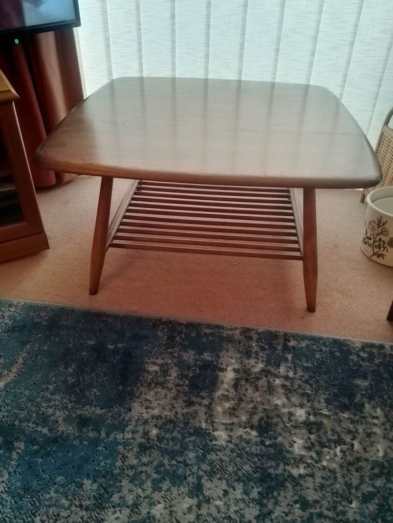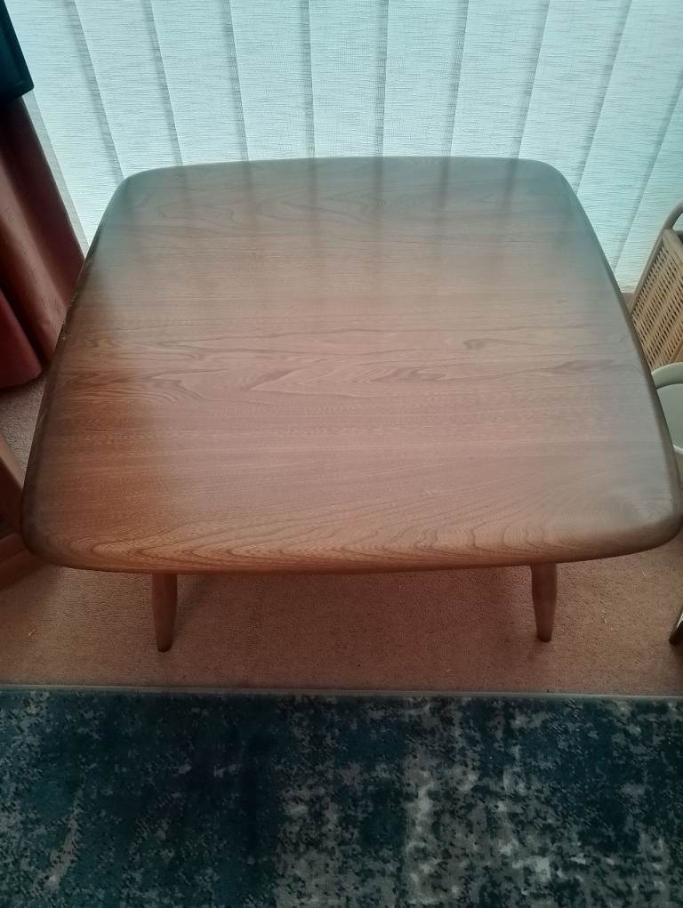 Retro coffee table. Solid elm. Square top with rounded corners. Under-tier magazine rack. 75 x 75 x 40 cm. Collection only. Nether Stowey