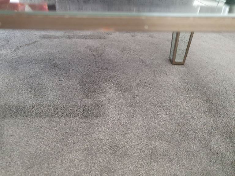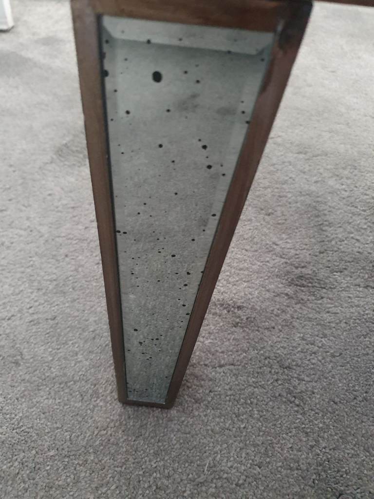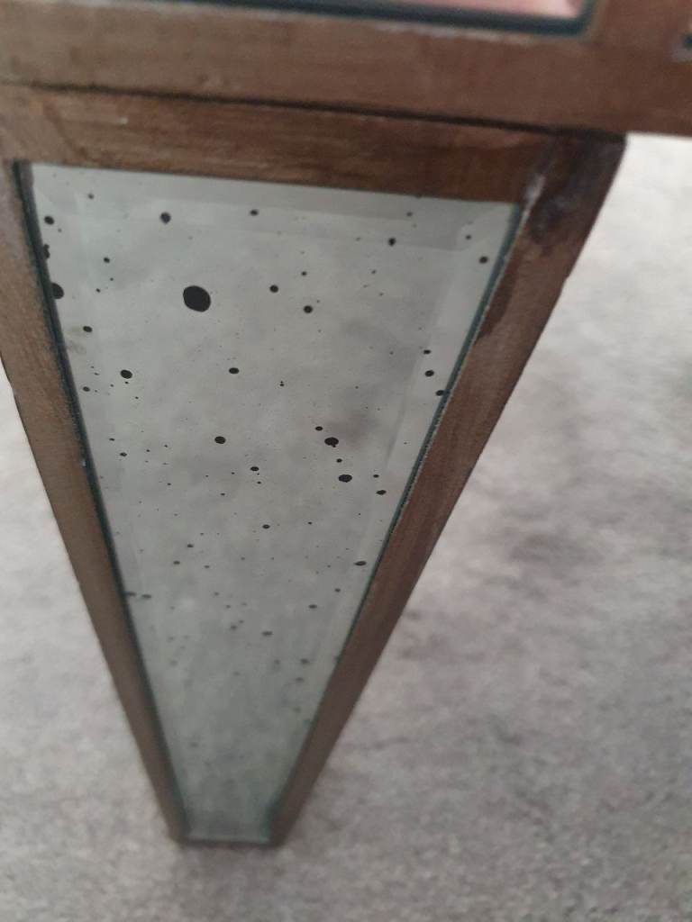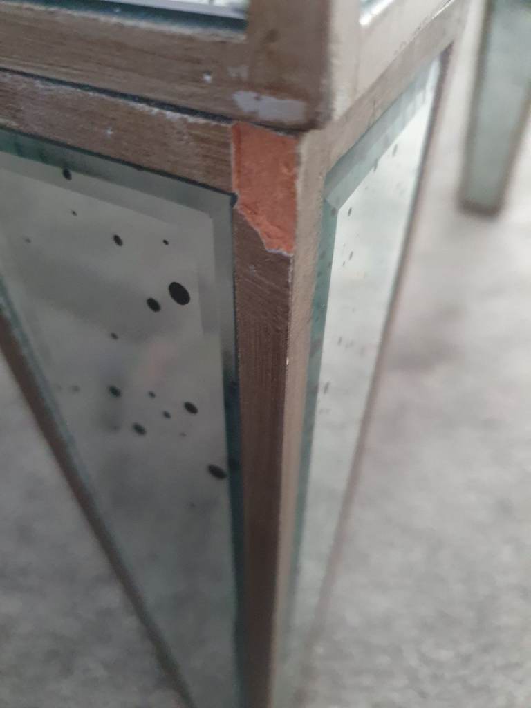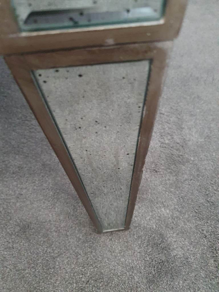 A couple of very minor scratche on top.of the coffee table which are barely noticable. Some wear on the edging of both tables as shown in pictures. Both are still very usable. The tops are plain mirror but the sides and legs have a black dot pattern on them which is shown in the pictures.