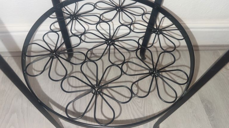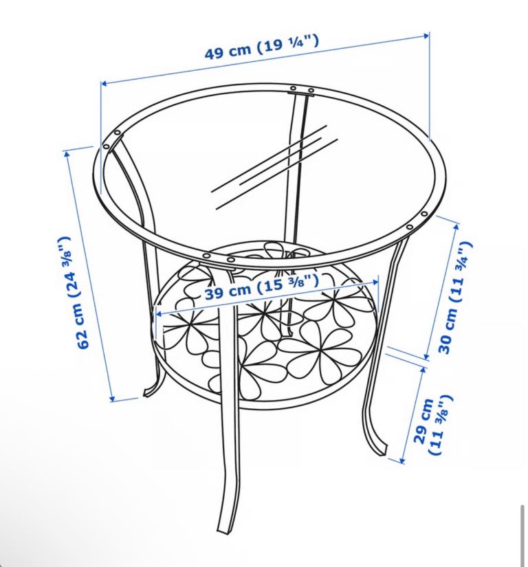 Table with curved legs in black powder-coated steel and a table top in tempered glass give KLINGSBO side table an elegant look. The lower shelf with a nice floral pattern is perfect for magazines or books.