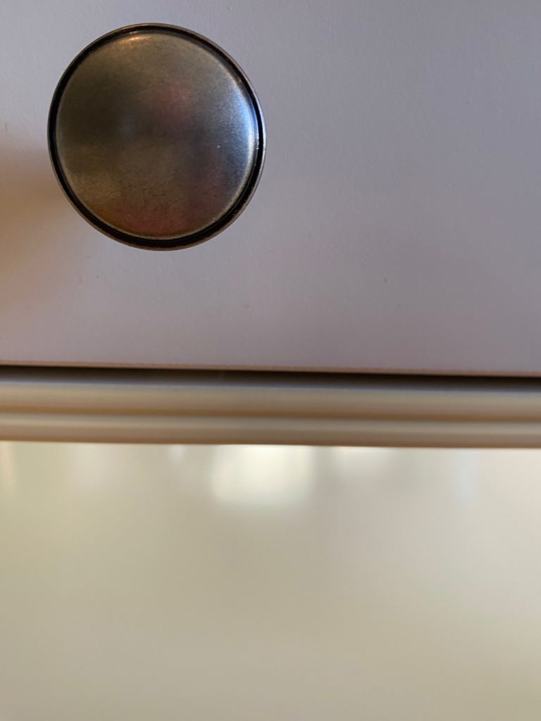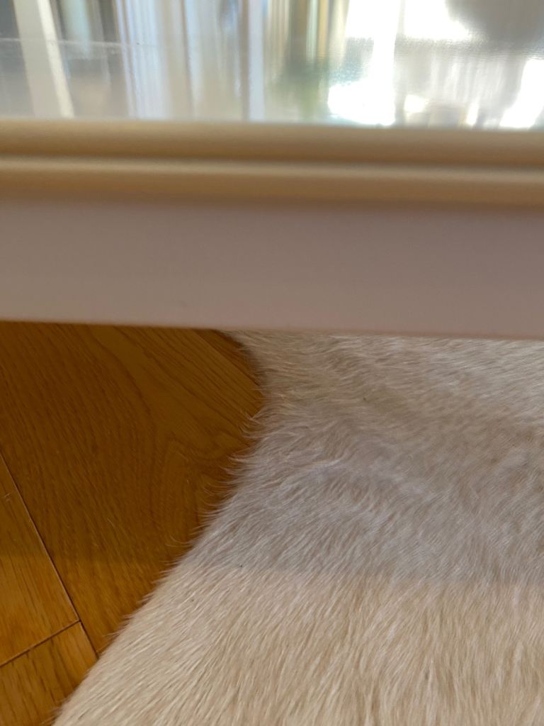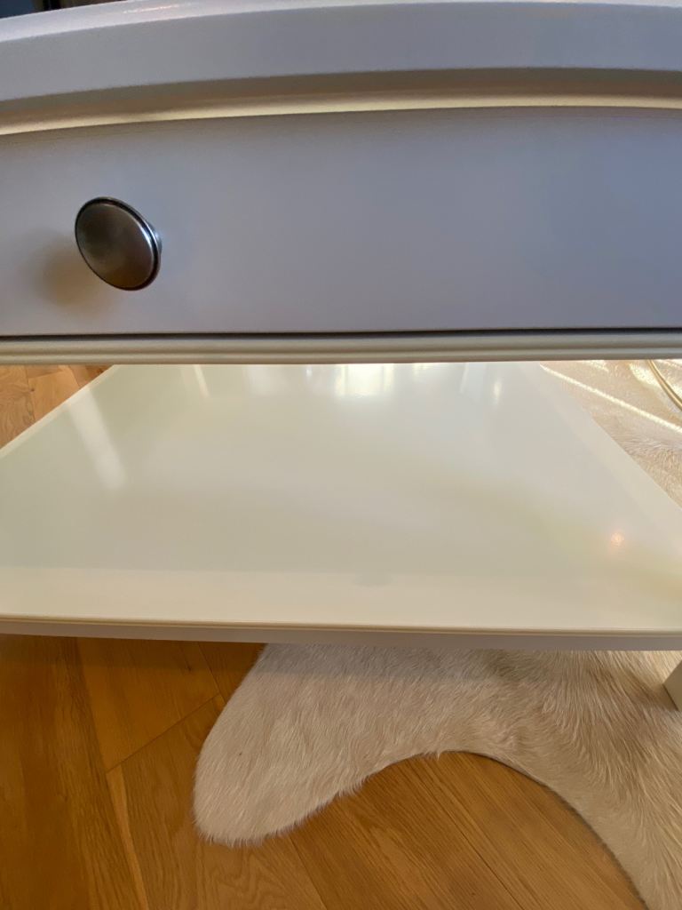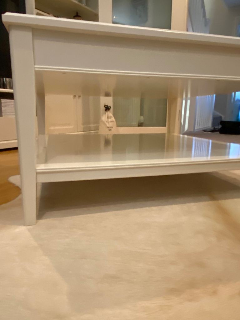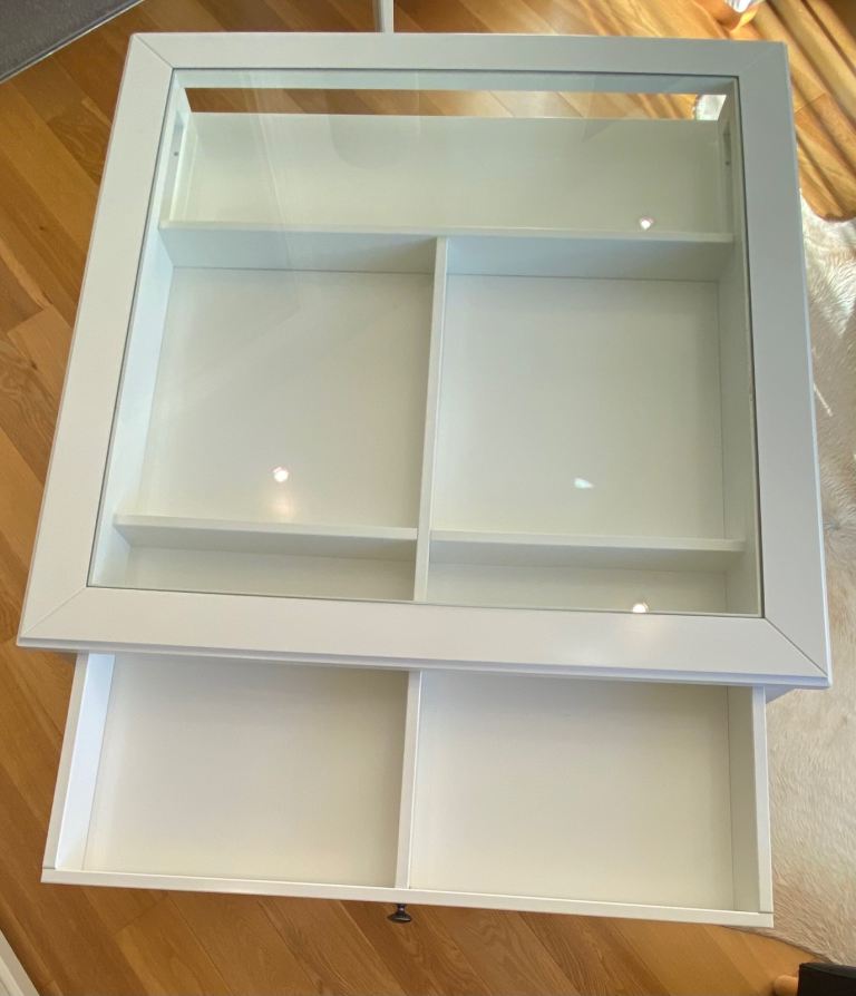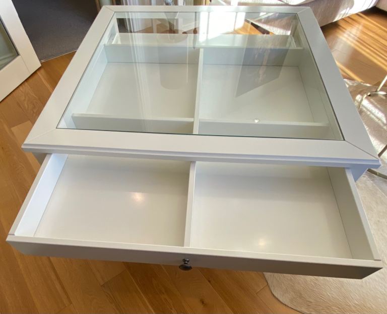 Large white coffee table with storage/display drawer with 4 compartments. Slight sun discolouration on small section of one side.