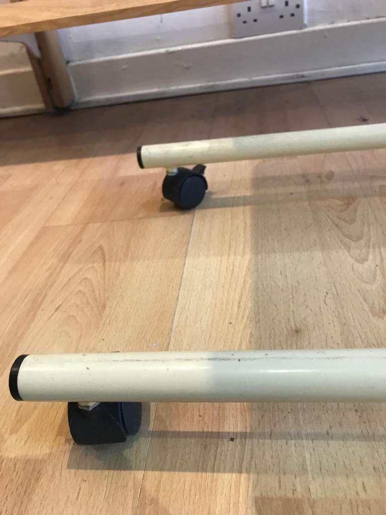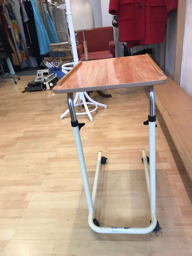 Lap table width 40cm,length 50cm, height 75cm. Imitation laquered wooden top on rollers for easy move ability Condition fair. Pick up in Prestwick by 31st January, cash only please