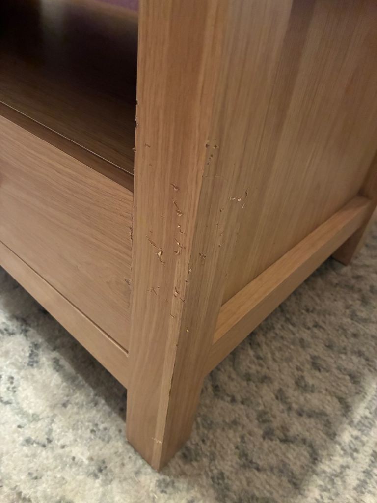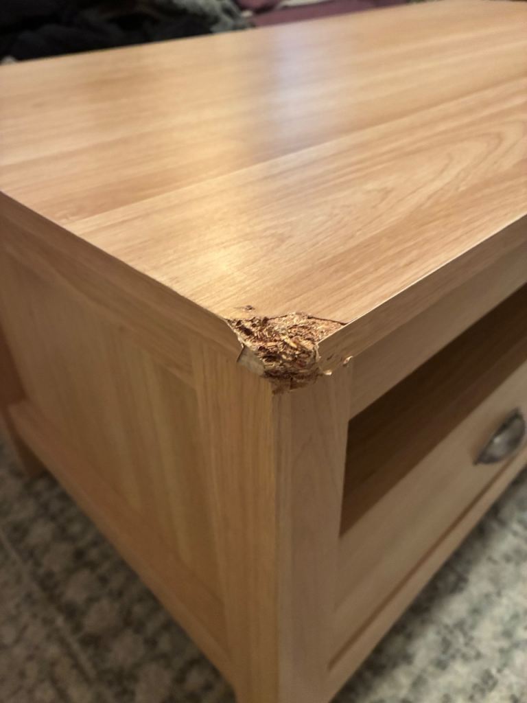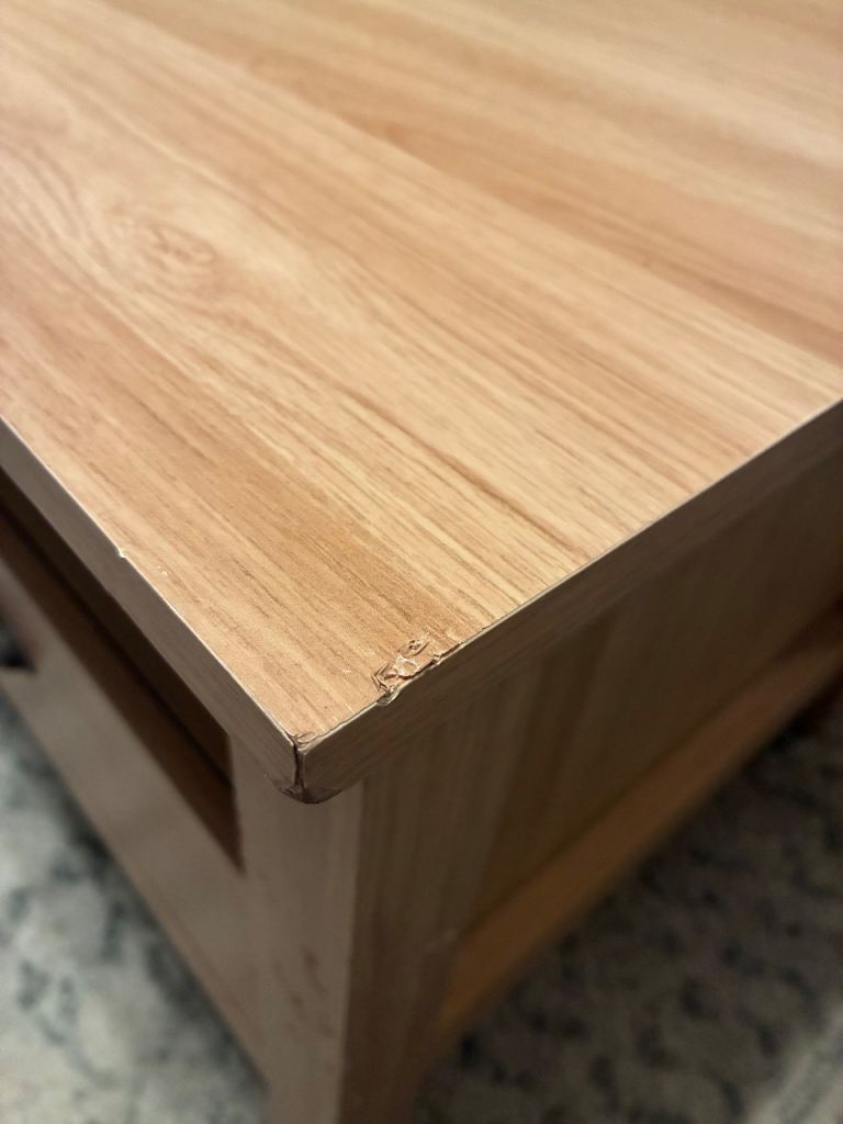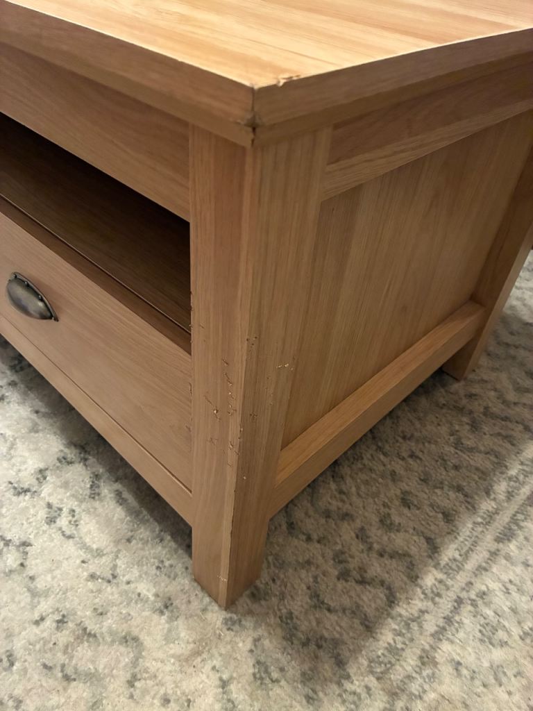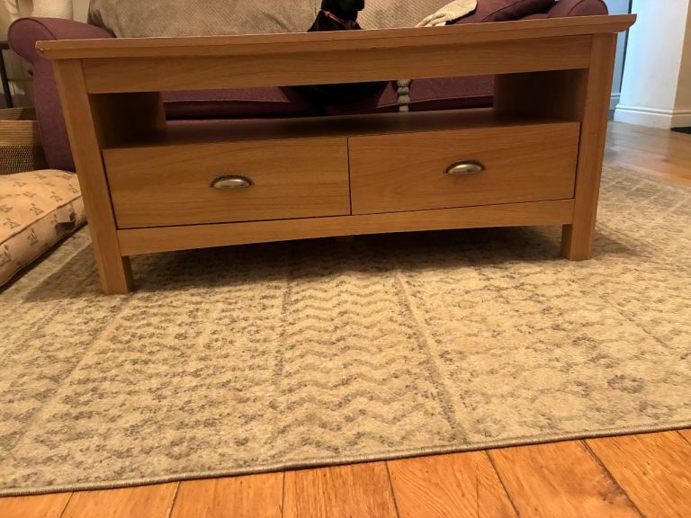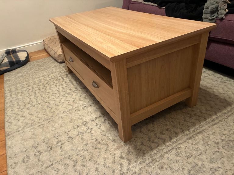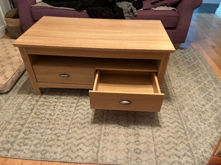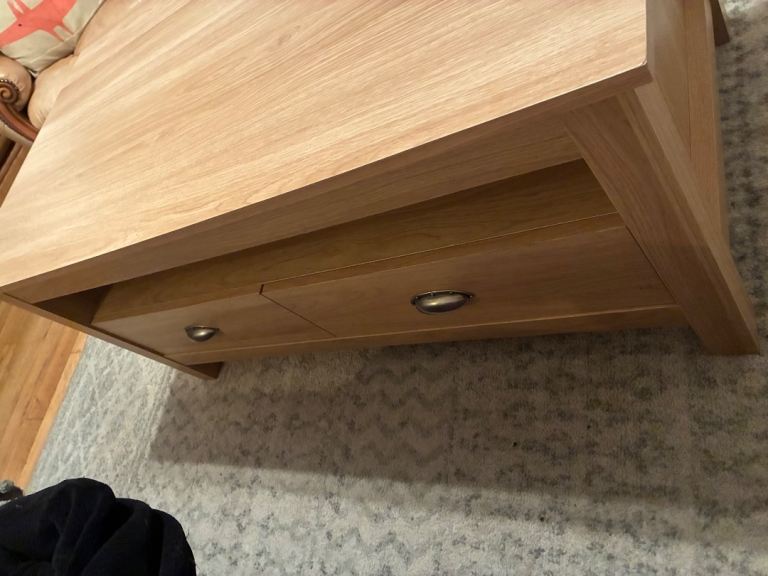 Large coffee table, measurements in photos, plenty of storage, one drawer on either side. Marks as seen in photos. Quite heavy.
