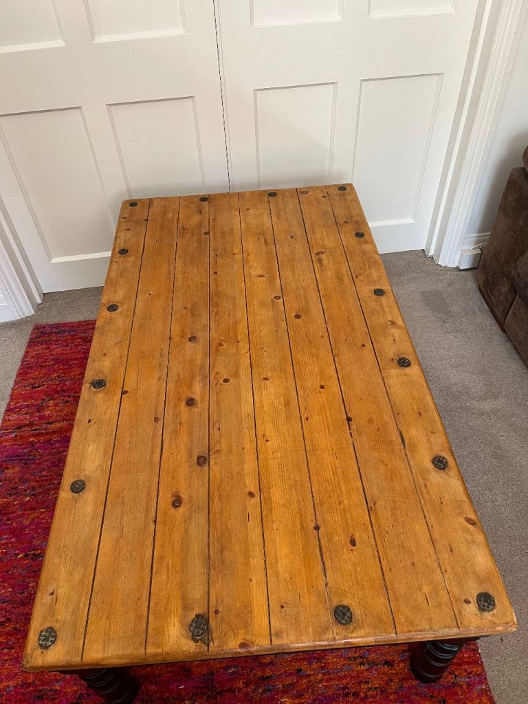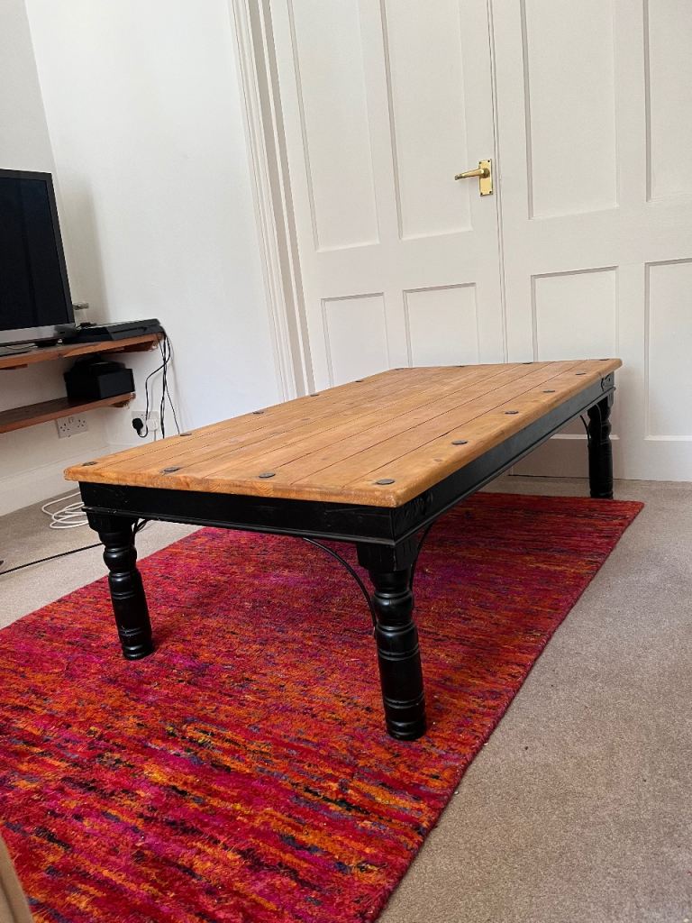 Large coffee table in wood with metal hinges on side. 135 x 75 cm