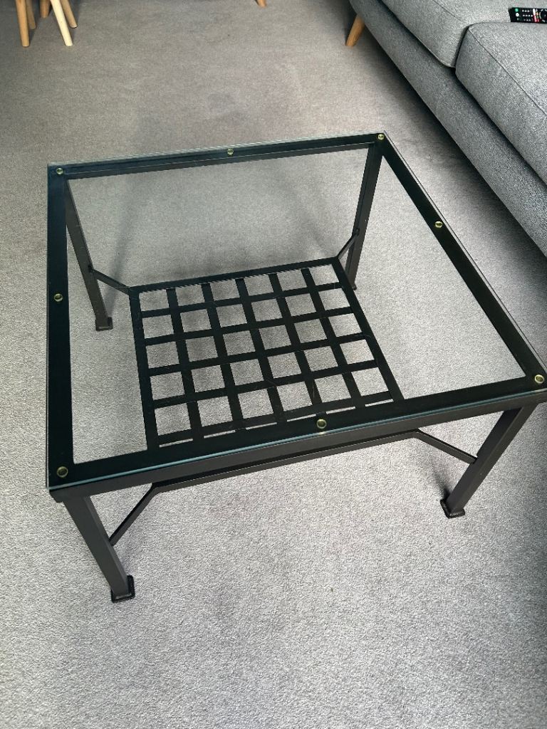 Lovely heavy coffee table of black metal and glass top with shelf for papers underneath. It measures 68cm square by 44cm high. Few minor scratches on glass but not visible unless looking for them.
