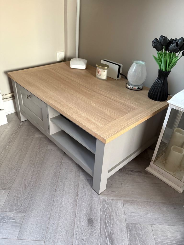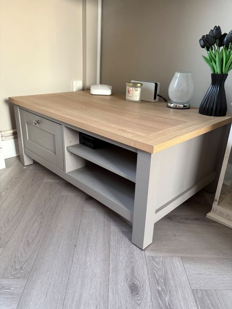 NEXT Dove Grey Malvern Oak Effect Storage Coffee Table for sale, immaculate brand new condition no marks or scratches. It also has a another drawer and shelf on the other side too.