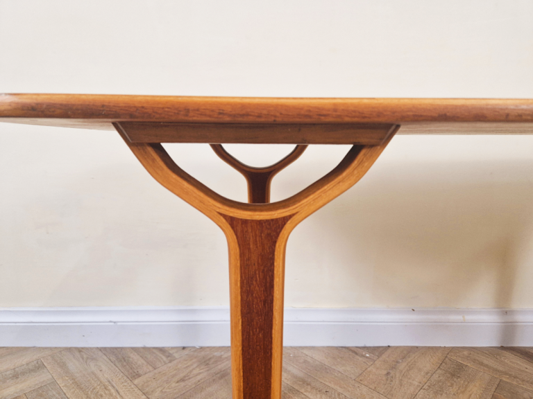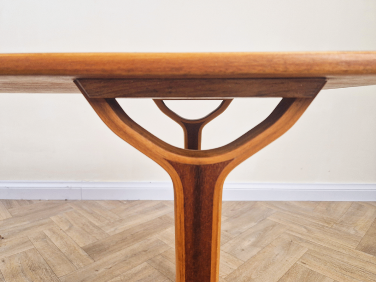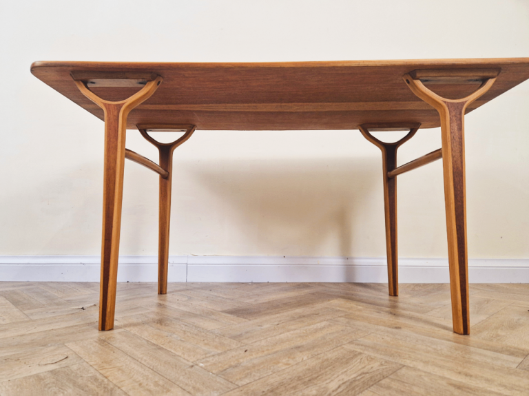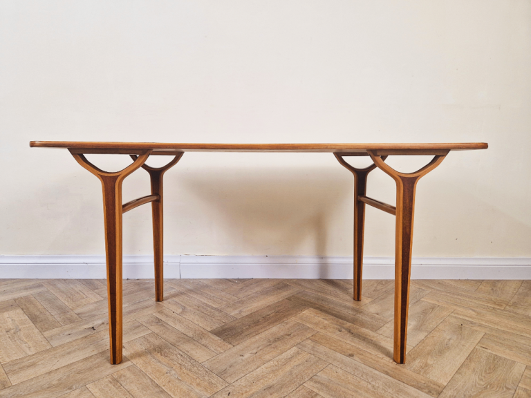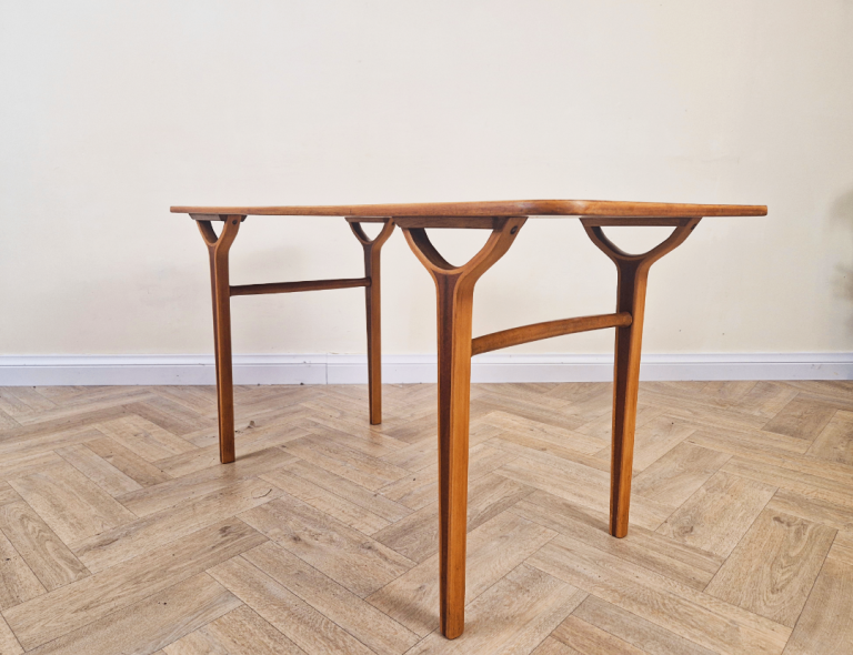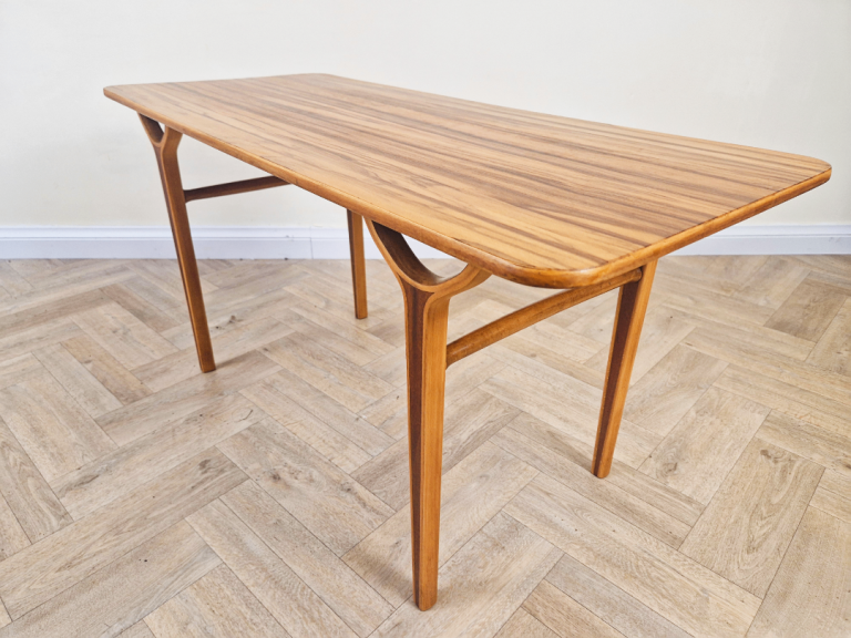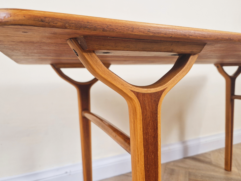 Designed for both functionality and aesthetic appeal, the table's light, airy structure reflects the era's commitment to modern simplicity. This piece beautifully combines organic materials with timeless Scandinavian style, making it a standout addition to any interior.