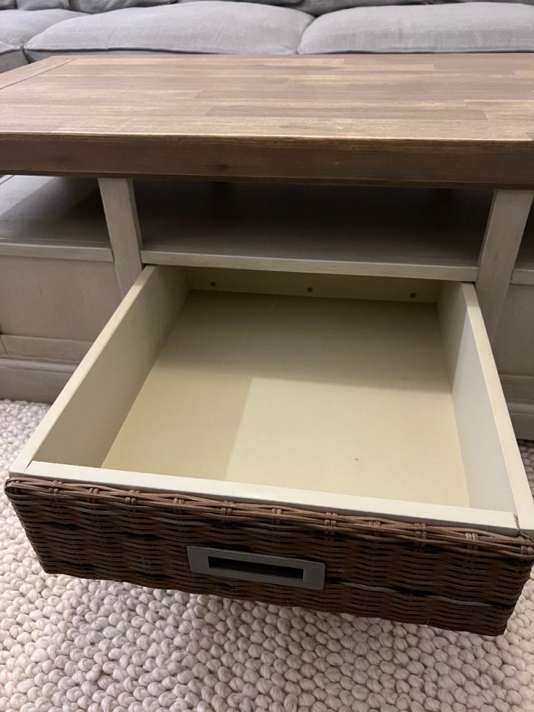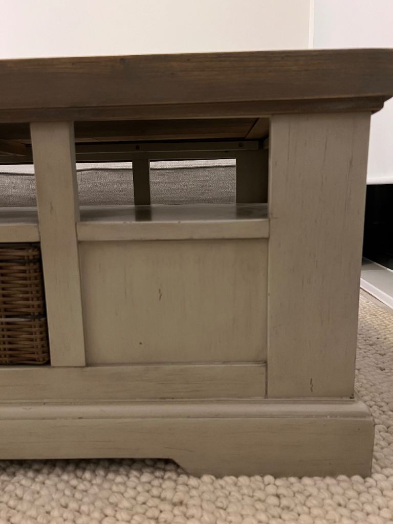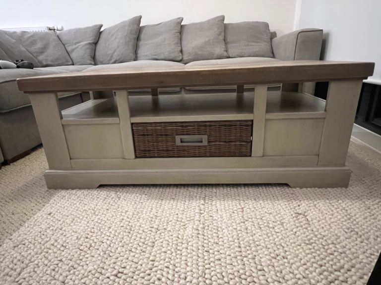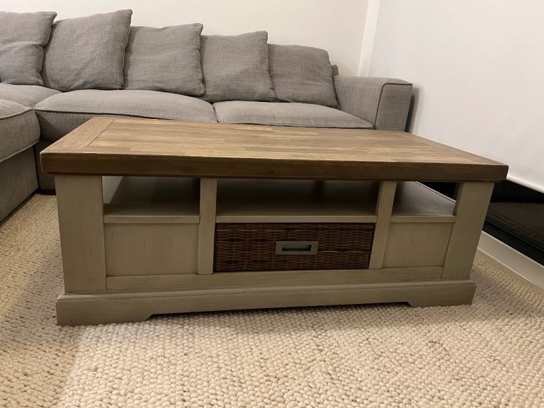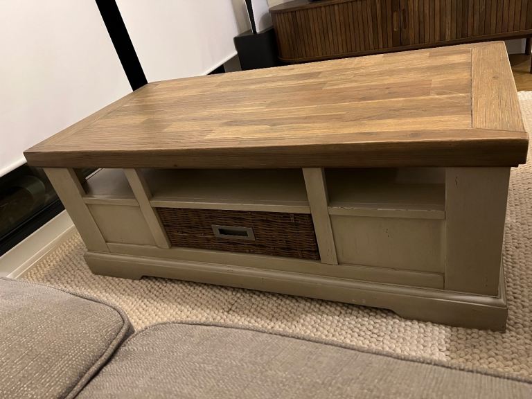 High end quality rustic solid wood coffee table with chunky wooden top and cream farmhouse-style base.