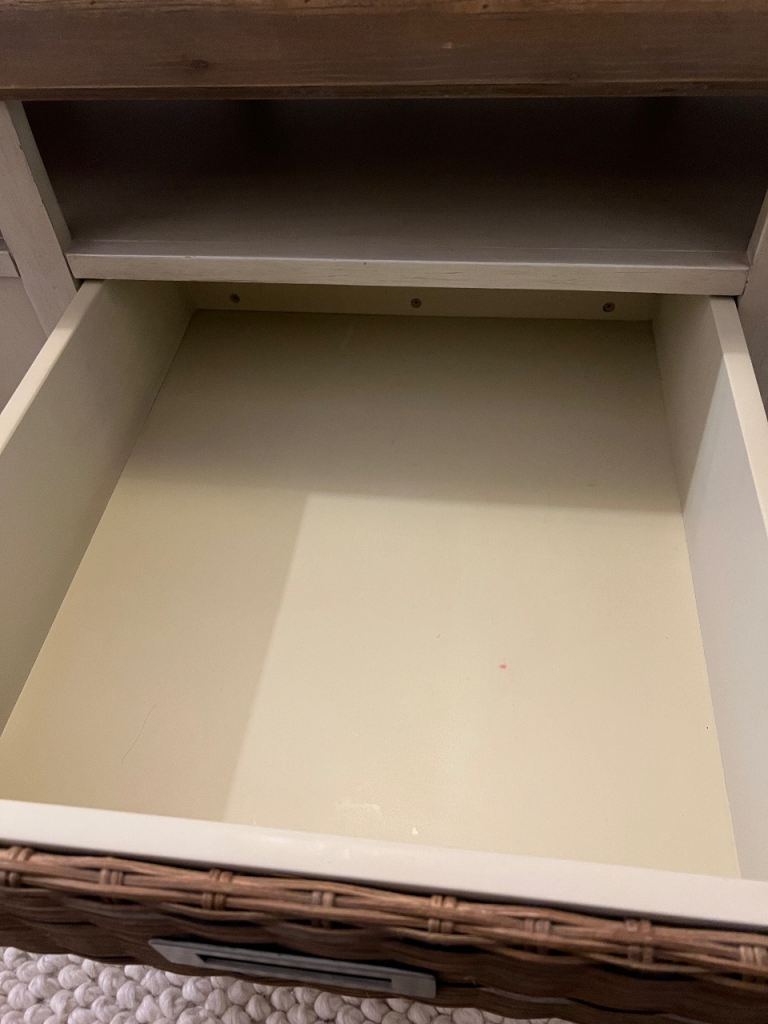 Features large pull-out wicker drawer with full-width storage plus open shelving.