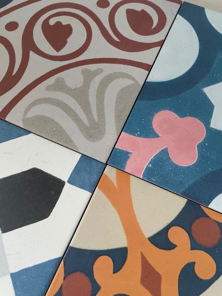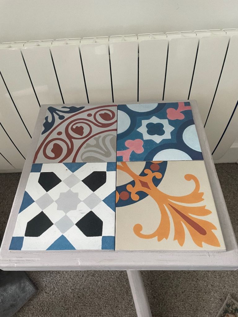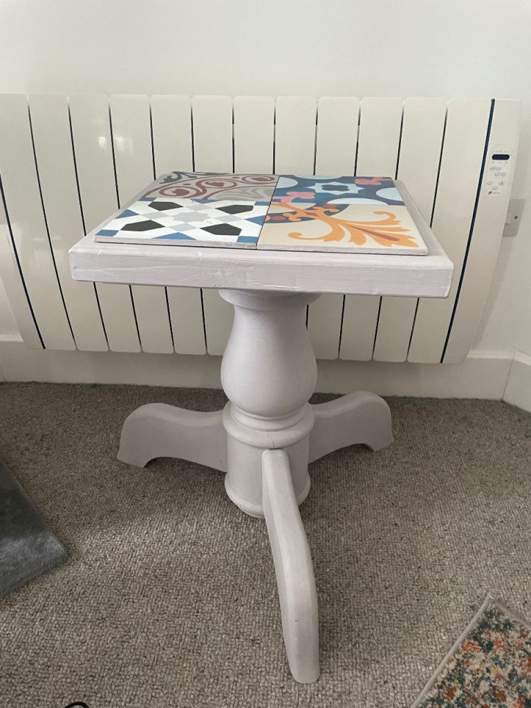 Upcycled table, painted with a grey/pink Annie Sloan paint & clear wax, topped off with colourful Spanish tiles.