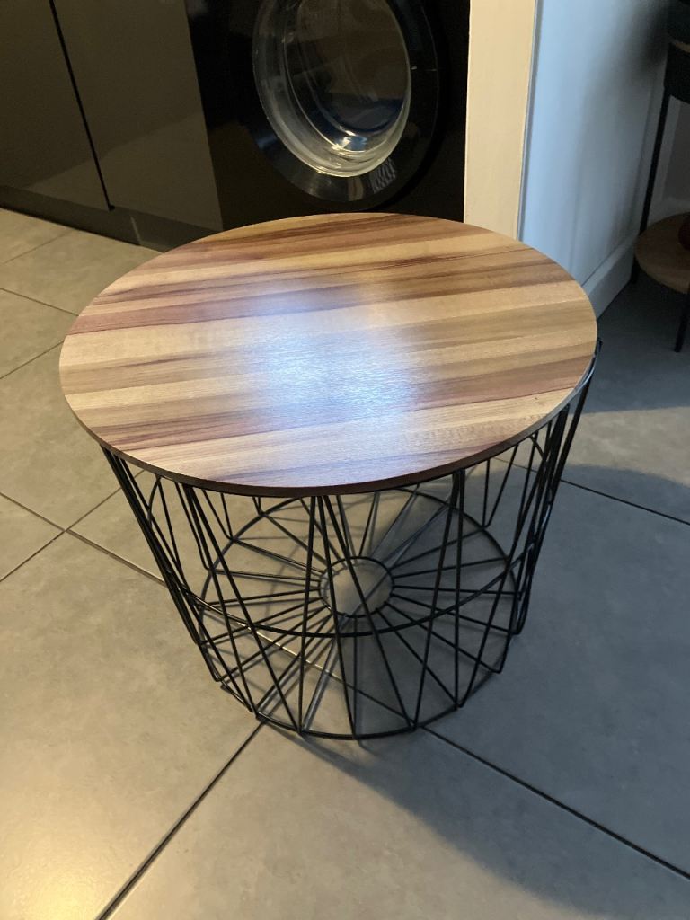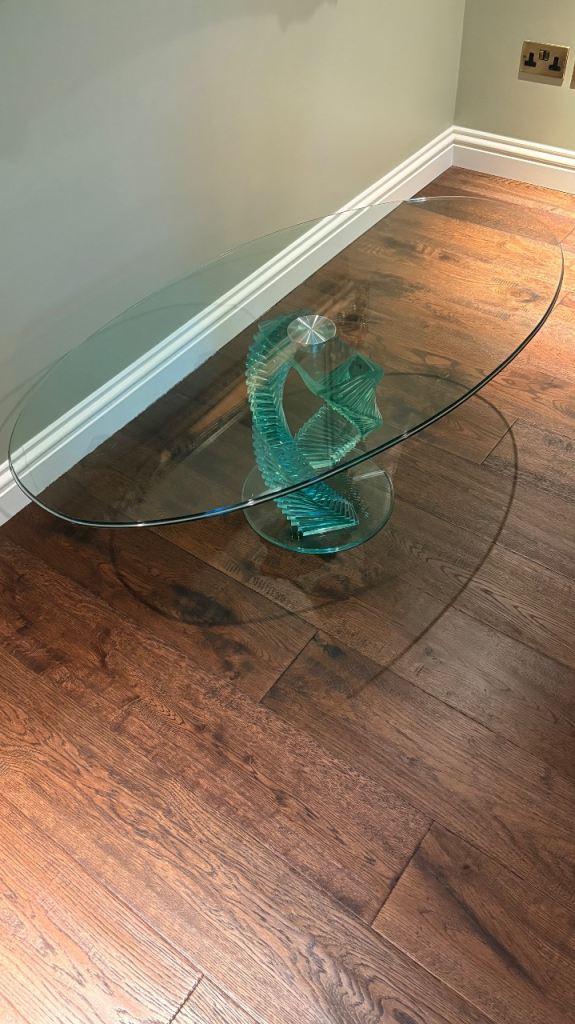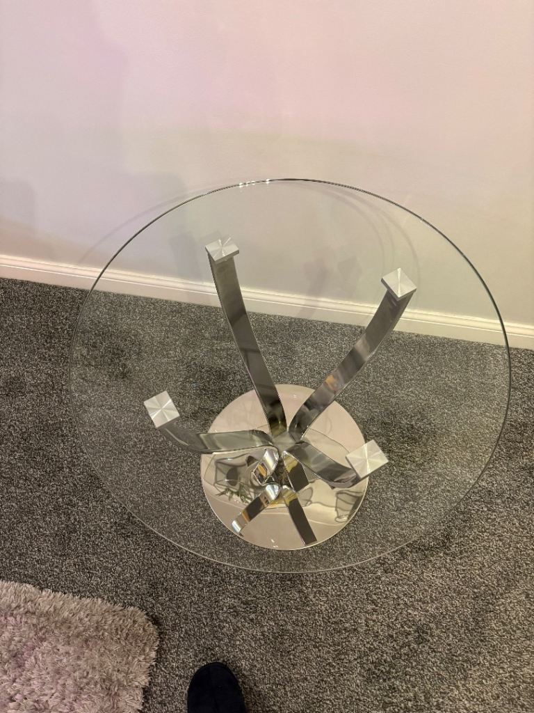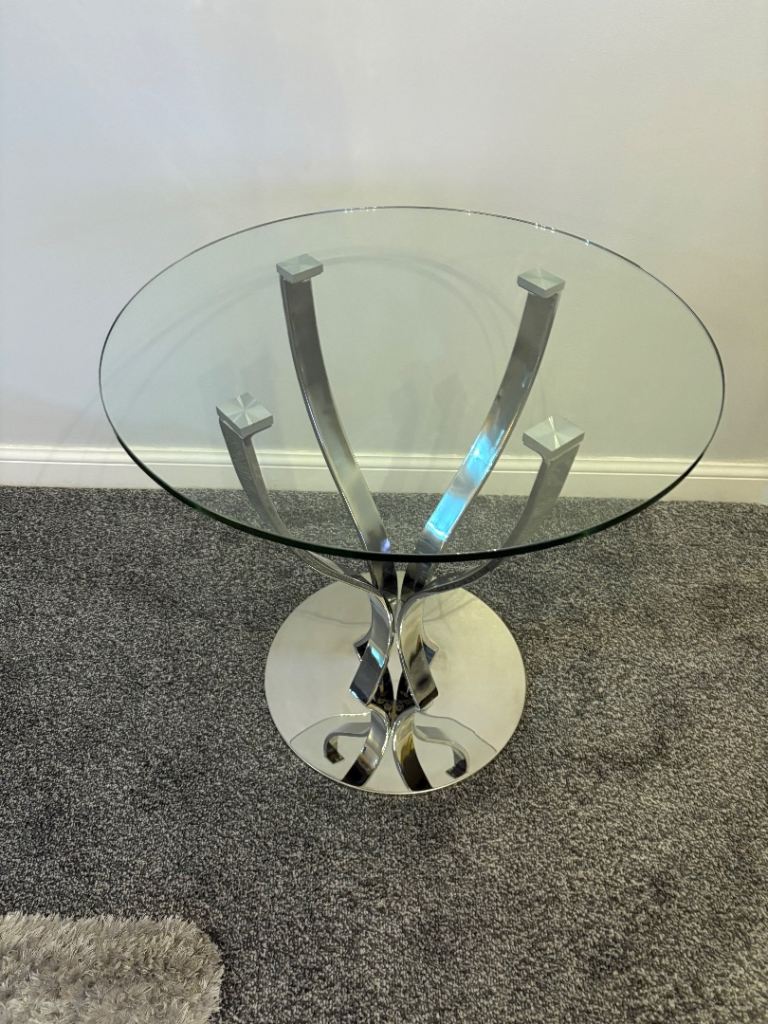 Glass and chrome heavy duty round side table, measurement’s height 59cm width of glass top 60cm base width 38cm , very good condition few marks on base don’t really see them bought from Next. OVNO