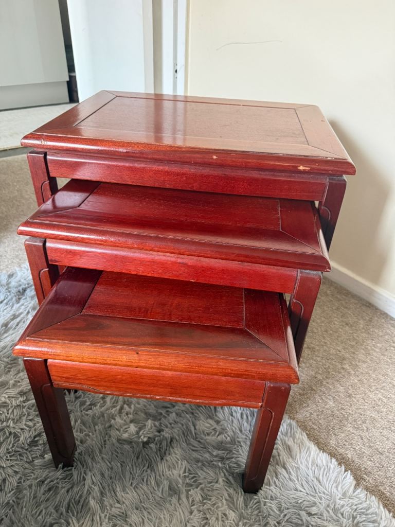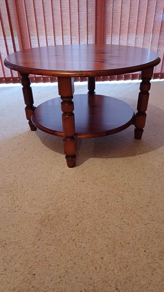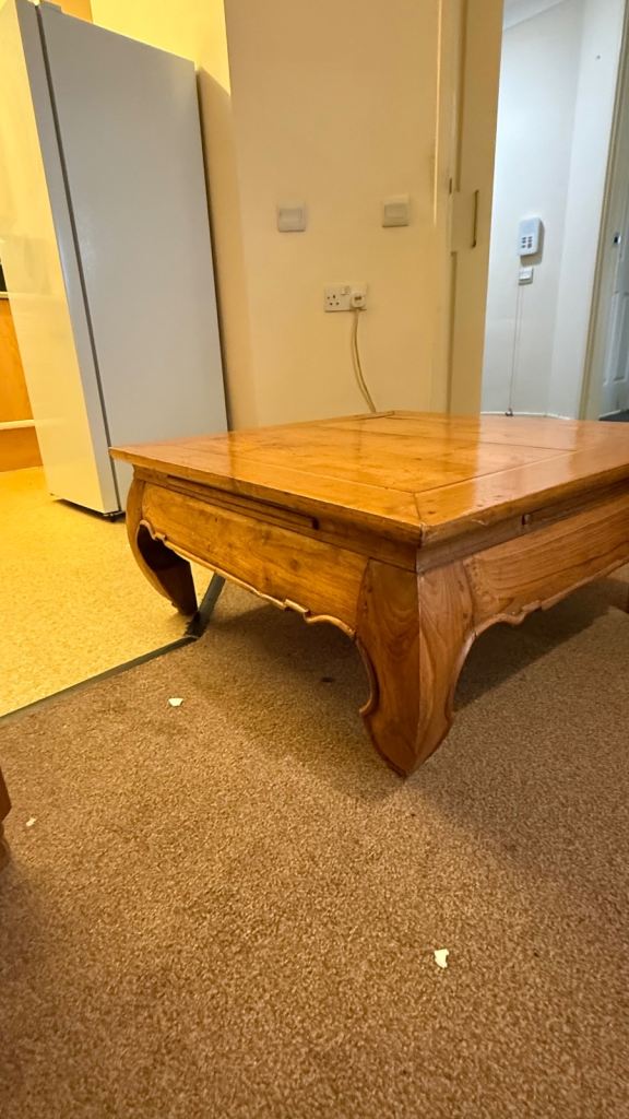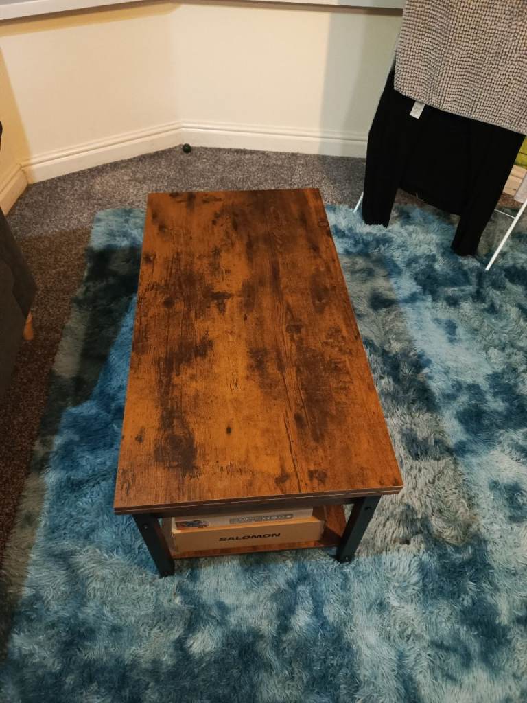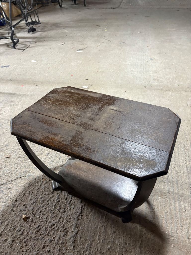 Small wooden coffee table with two layers. In reasonable condition except a crack on the top. Still fairly sturdy though.
