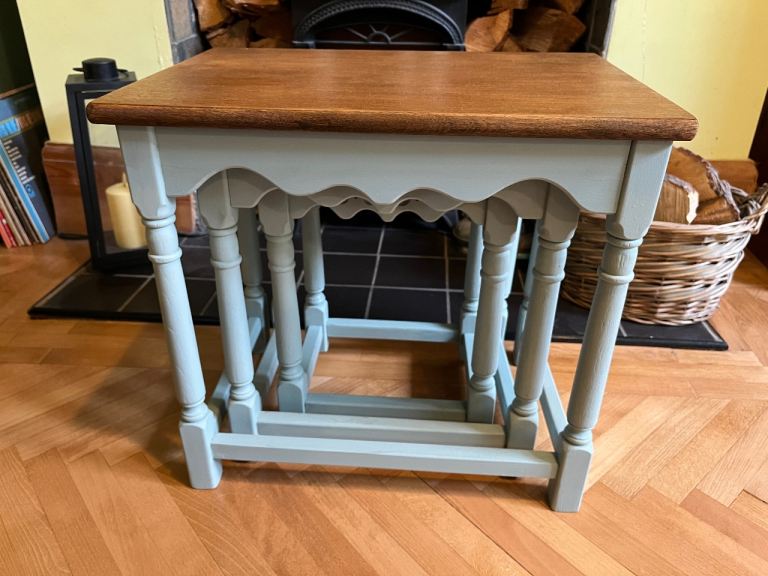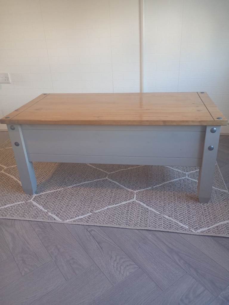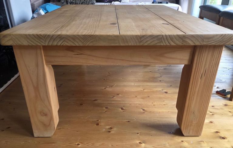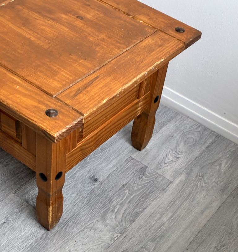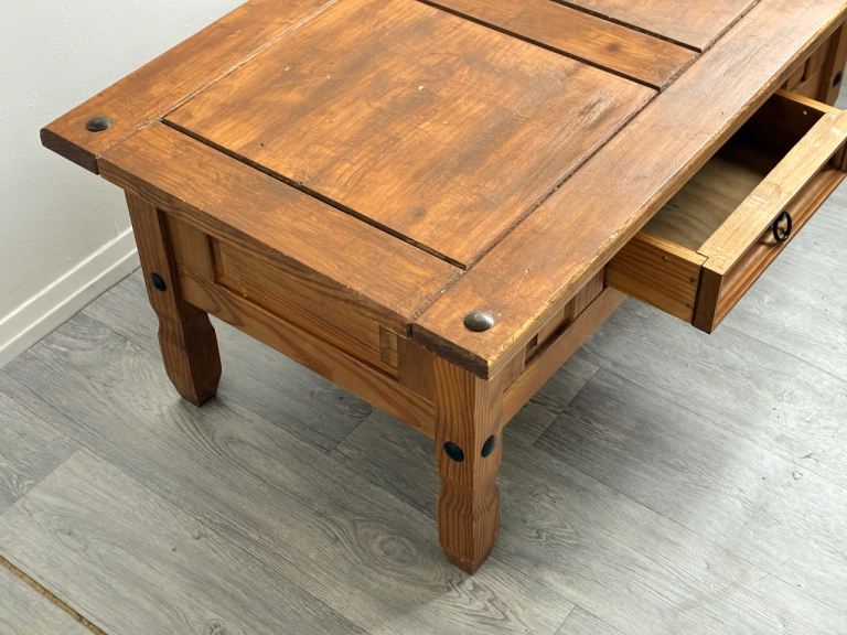 A solid wood coffee table with a warm rustic finish and black metal detailing. Features a spacious central drawer with metal ring handle. Chunky legs and sturdy build make it a strong, durable piece. Lovely natural wood grain throughout. Some minor signs of use on the top (see photos).