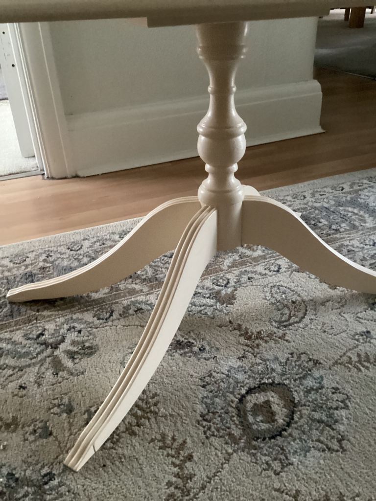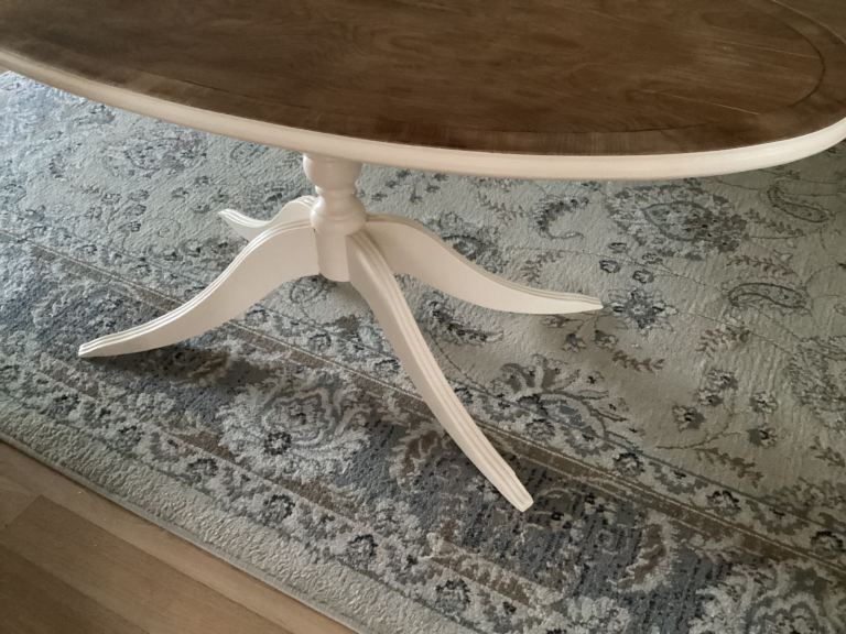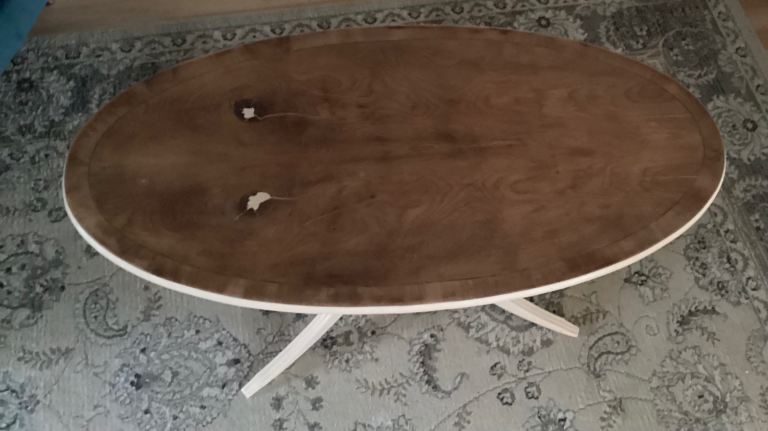Solid wood, cross banded vintage coffee table. Warm cottage cream colour with a very detailed wood grain top. £60 or in the region of.
