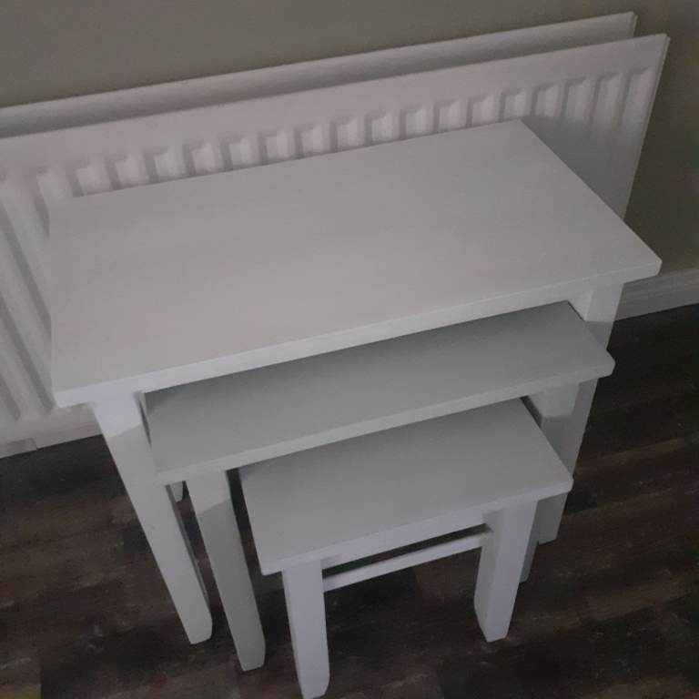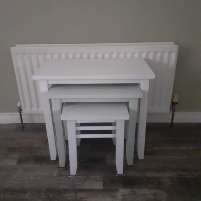 Lovely solid wood nest of 3 tables, chalk painted: cushion white, antique sage and dusty morning .
