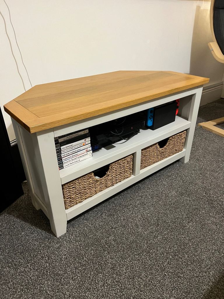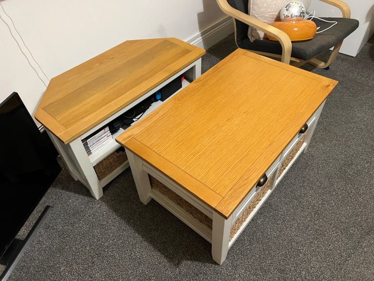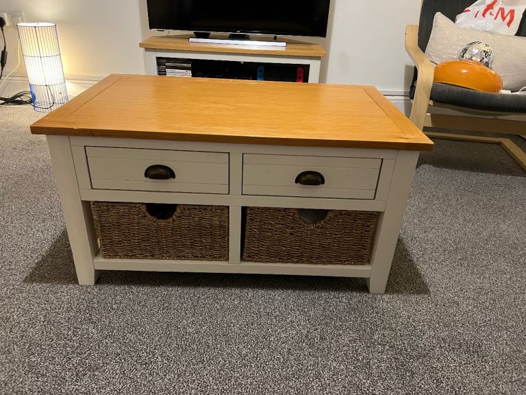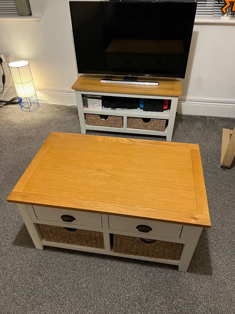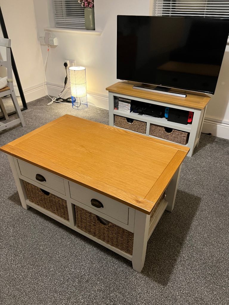 Matching solid wood country-style TV unit and coffee table in great condition. Has very strong wicker basket-style drawers, perfect for storage and adding a rustic look. Clean, sturdy, and ready to go.