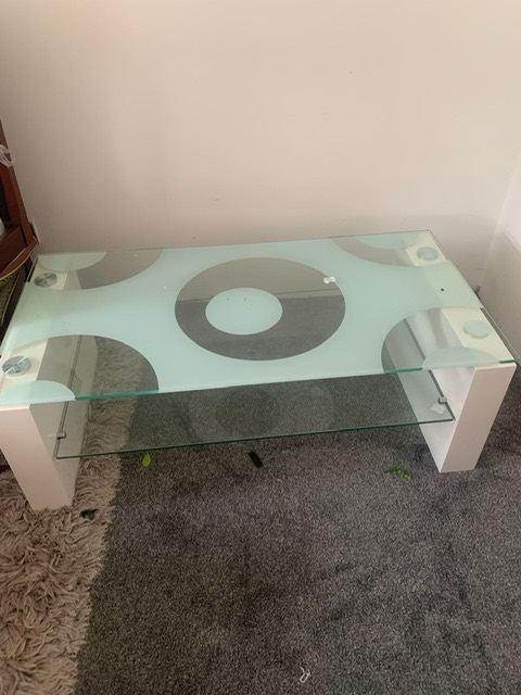Heavy duty glass table. A screw missing from the bottom shelf of the table.