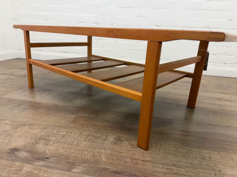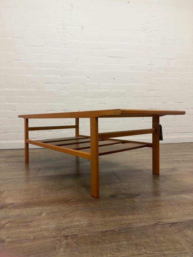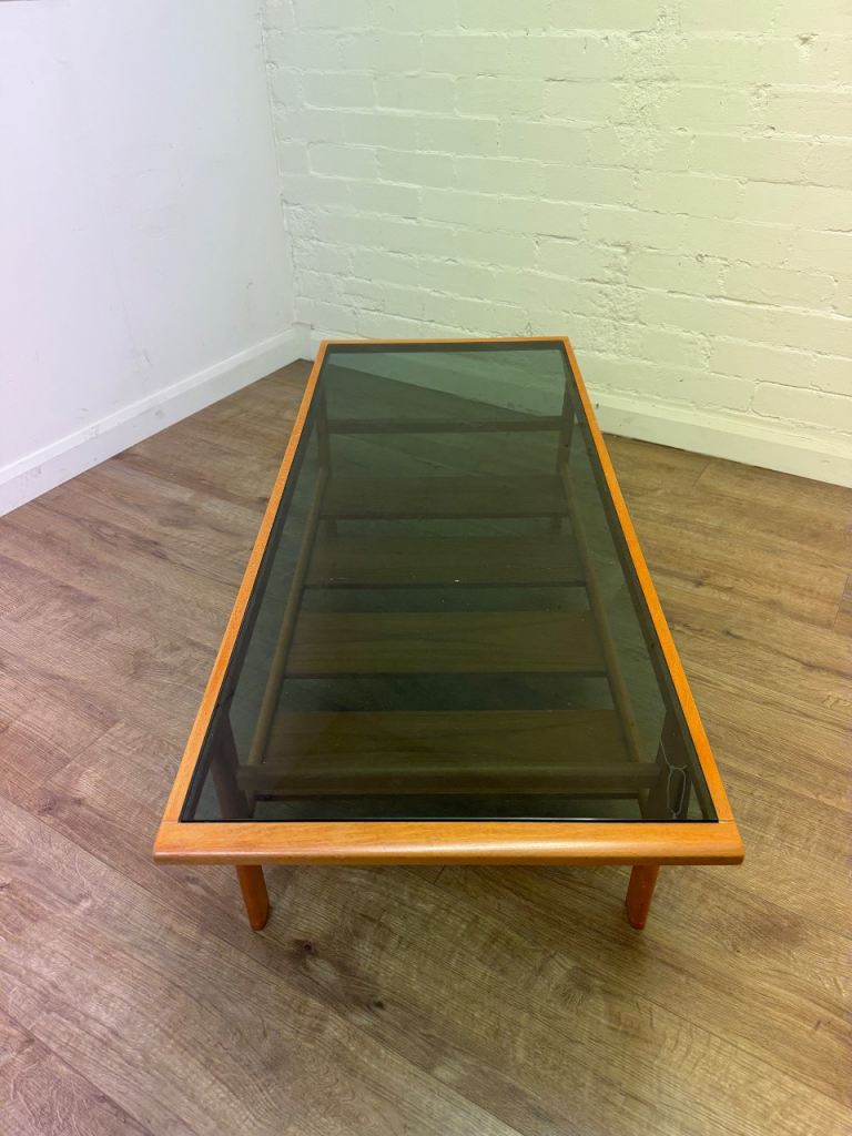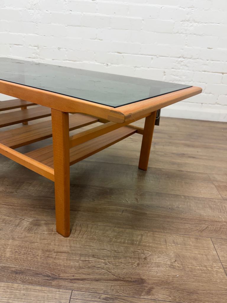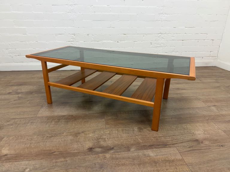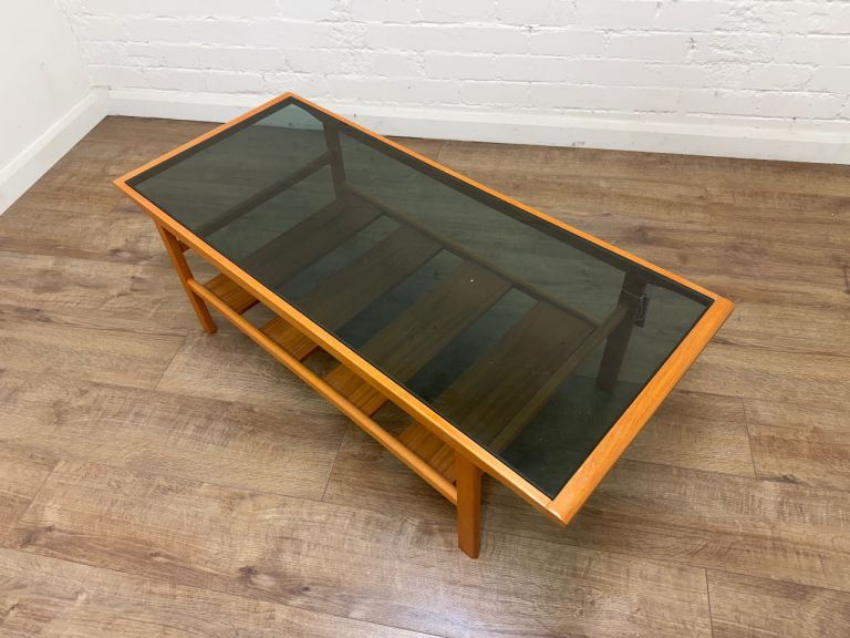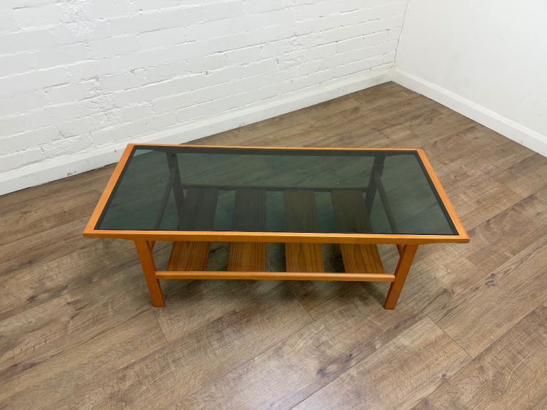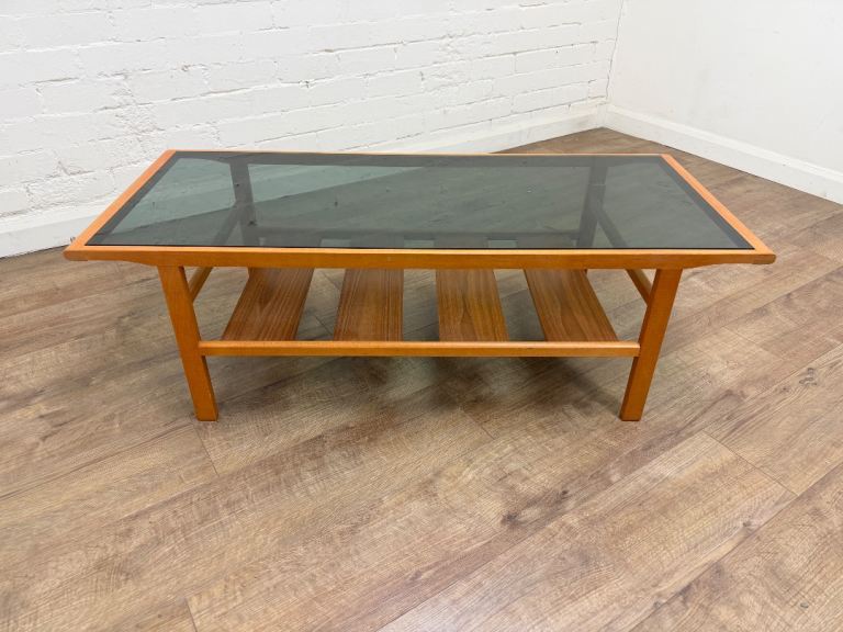 Teak mid century smoked glass top coffee table. Lovely vintage design and shape. Magazine rack on base too. Nice clean condition.