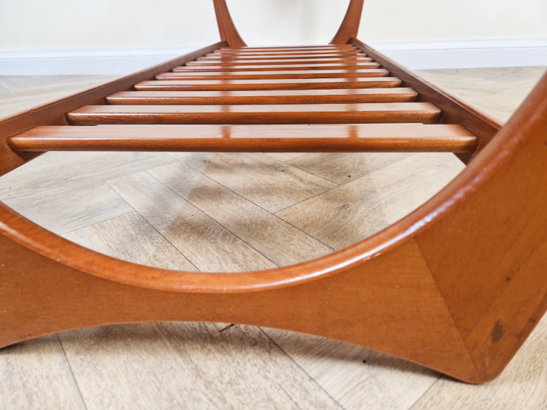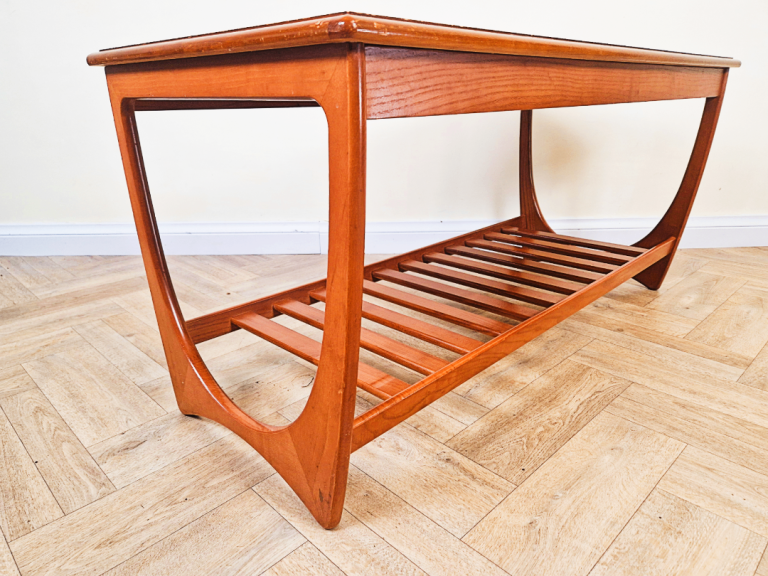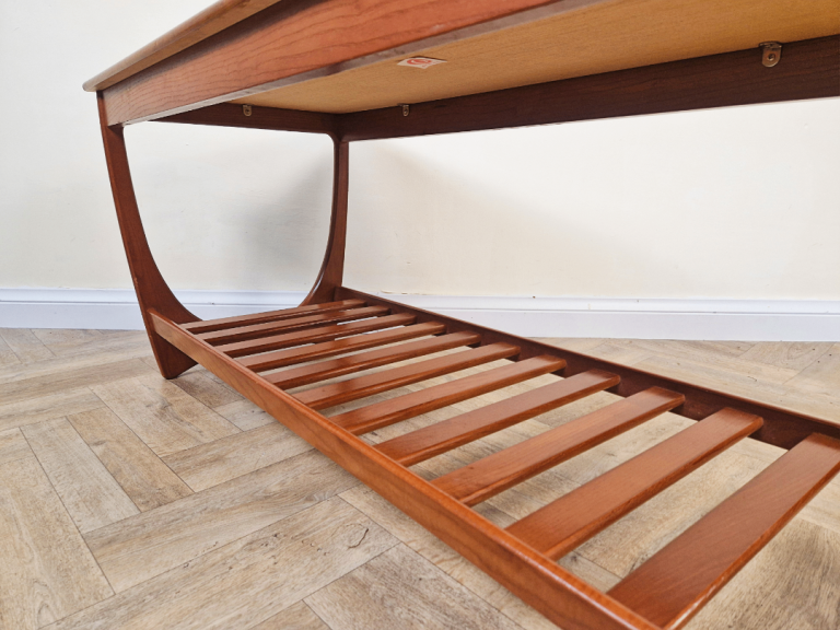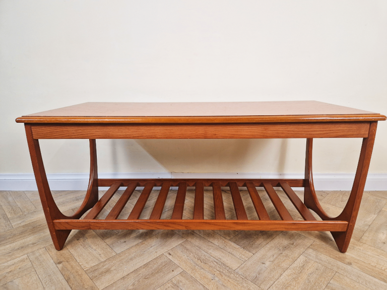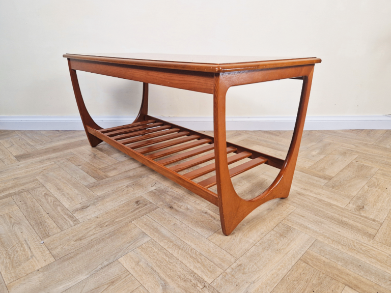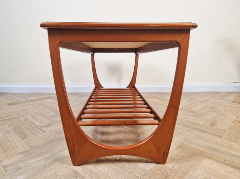 Iconic G-Plan Brasilia coffee table in solid teak, featuring the highly desirable original magazine rack. This versatile mid-century classic combines timeless elegance with practical function, perfect as a stylish focal point for any living space.