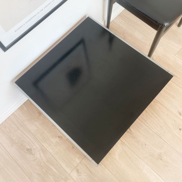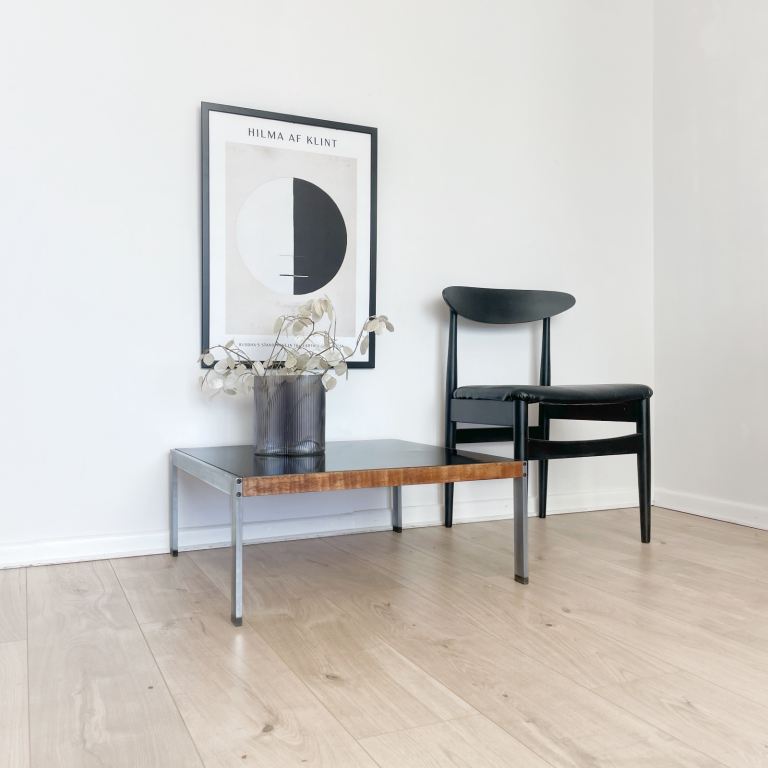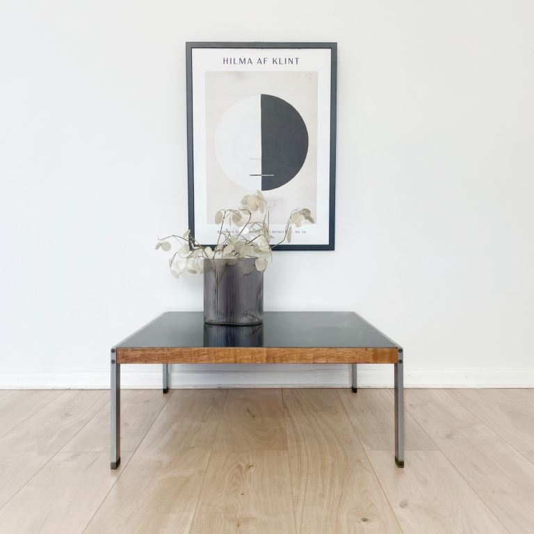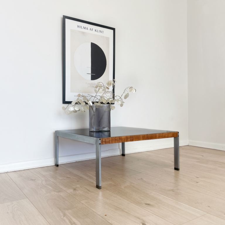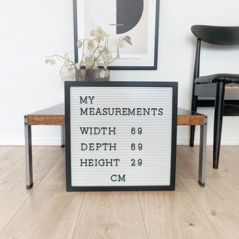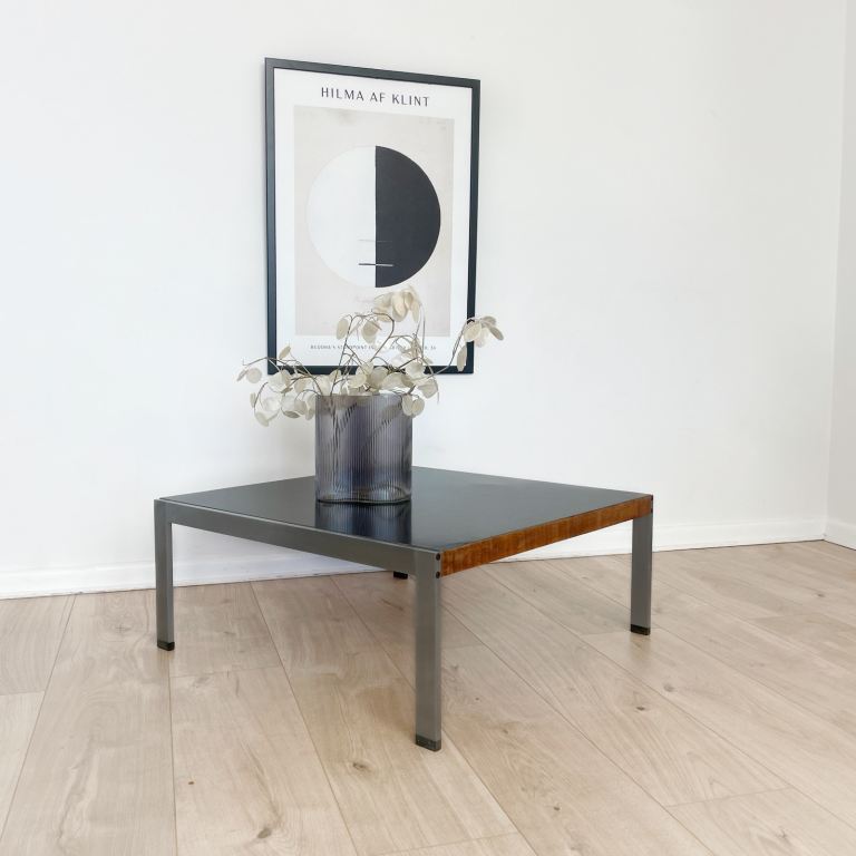 Vintage 70s coffee table, with stainless steel frame, teak detail and black Formica top.