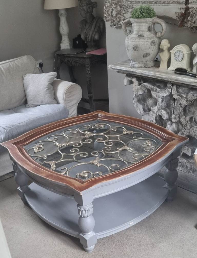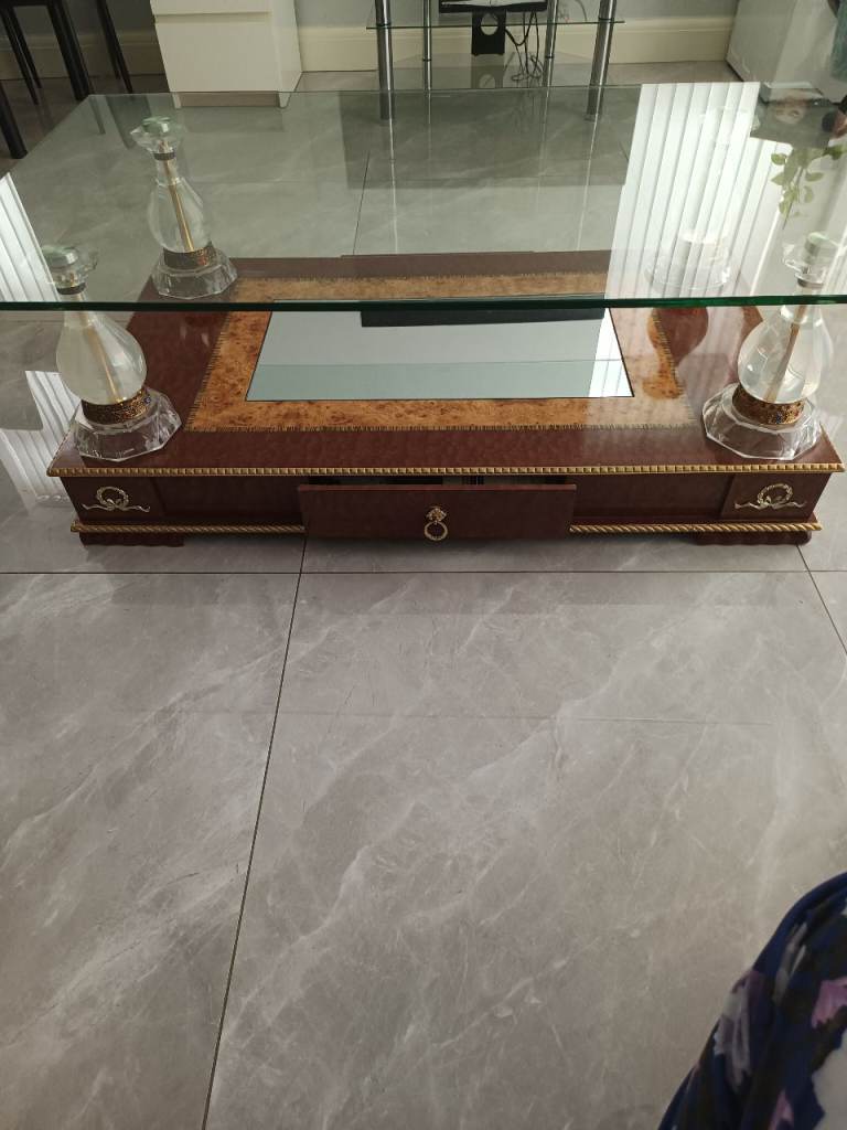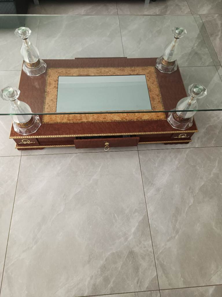 This Antique coffee table is crafted from rich Mahogany with a glass top, mirror and two sides drawers, adding a touch of elegance to any living room. The table features four glass holders and a lift top design, offering both functionality and style with it's Vintage charm and fully assembled construction this coffee table from a reputable vintage brand is sure to be a timeless addition to your home decor.