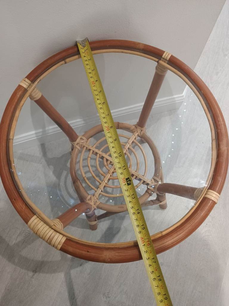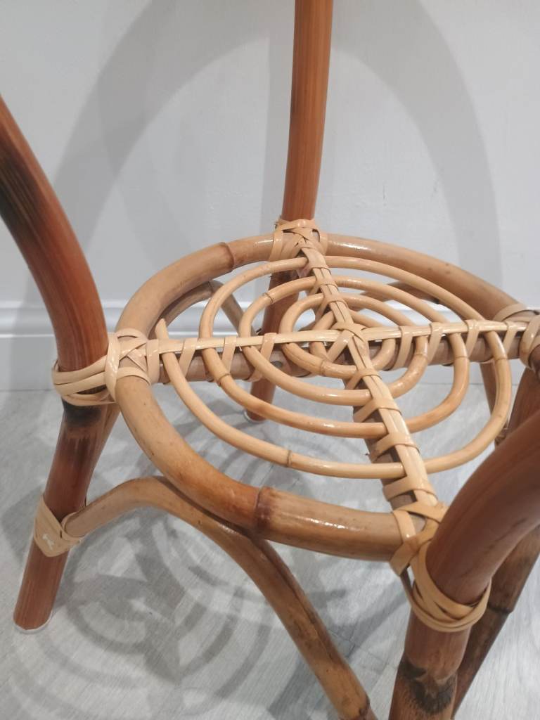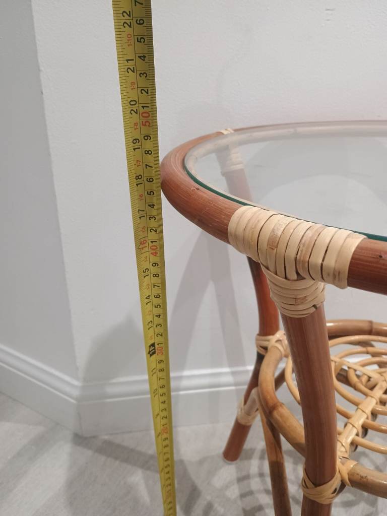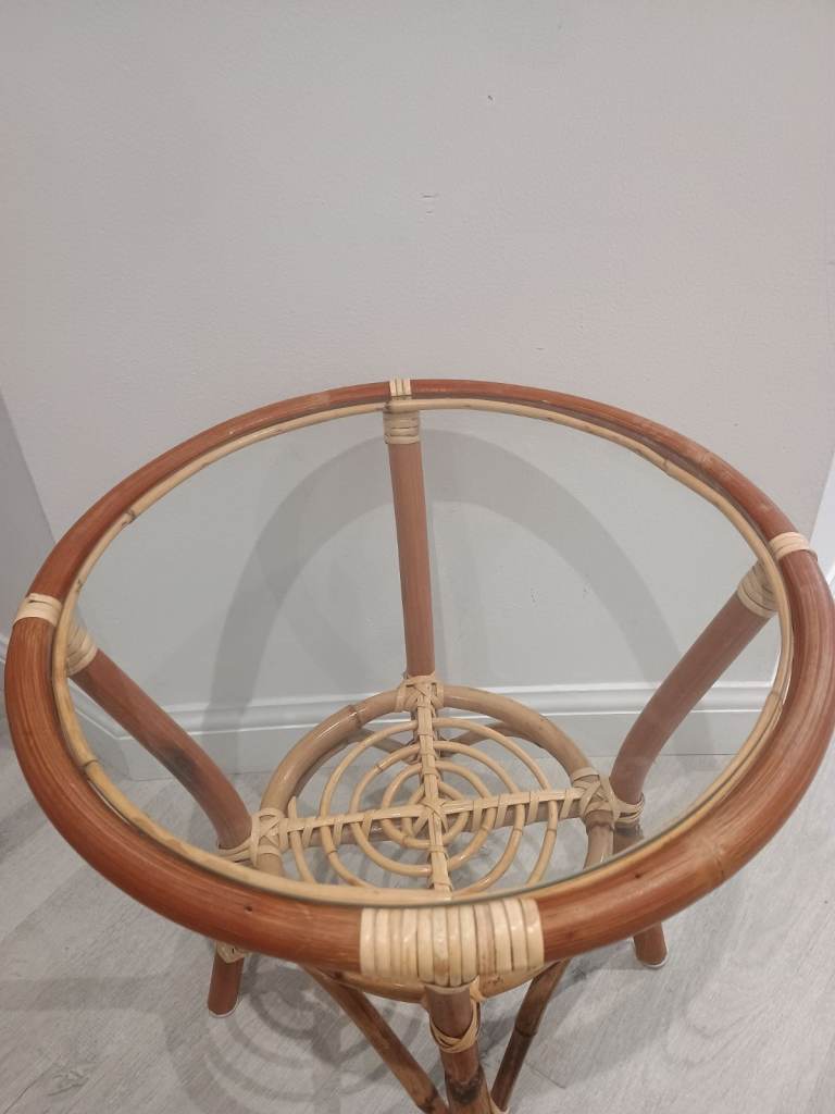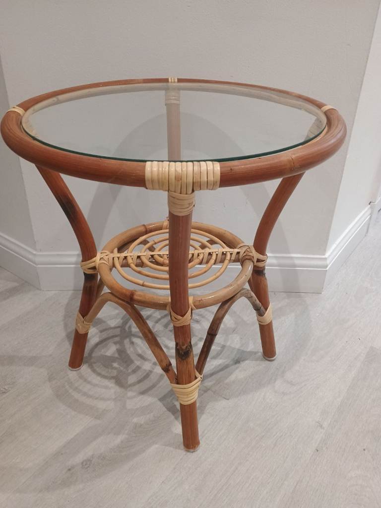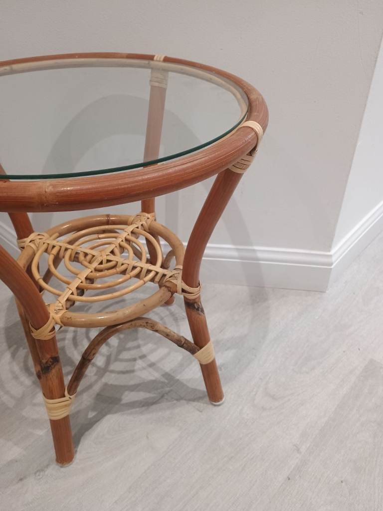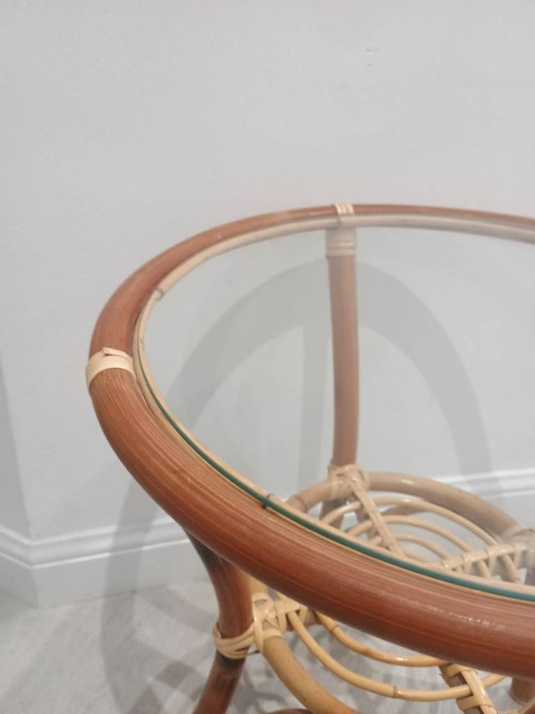 Vintage Mid Century Cane Bamboo Glass Topped Side Table With Shelf Retro